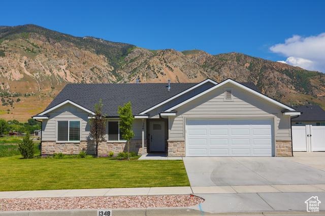 Single story home with a gate, a mountain view