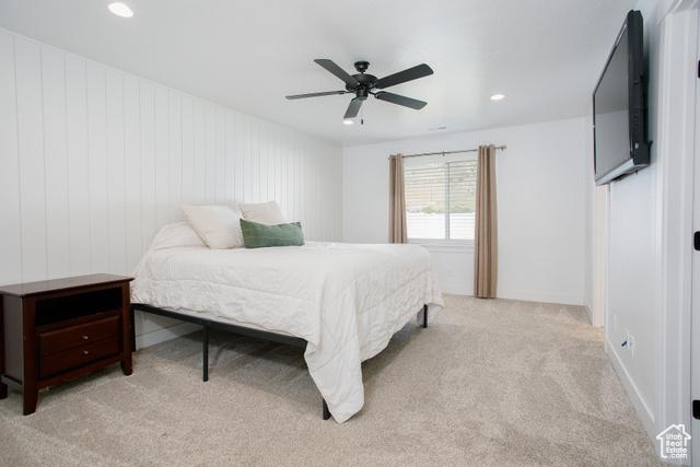 Bedroom featuring light colored carpet, recessed