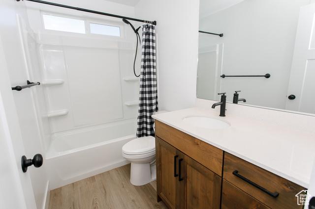 Full bathroom featuring wood finished floors, vanity, Bedroom