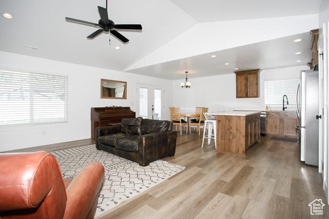 Living room with lofted ceiling, a chandelier, light woodstyle floors, ceiling fan, and recessed lighting