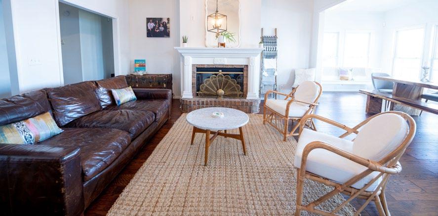 Here, nature is invited into the stylish home of 2023! Solid teak wood from Asia—shipped to the Richmond Hill, Georgia, home of Nisha and Rocco Giustino—capture the return to nature trend in their dining room space (above) that seeps into their living room as well (right).