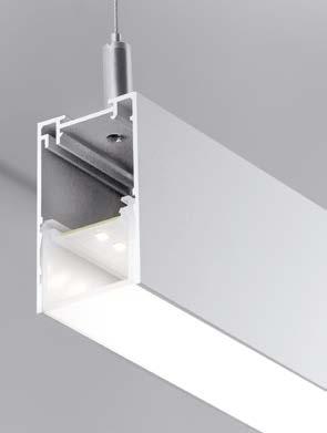 CUBE. Nepřímou složku svícení zabezpečí modul čirého plexi nebo do šířky svítící difusor (batwing distribution), který vytvoří rovnoměrnější osvětlení stropu. Jistě vítanou vlastností je také možnost závěsu ve spoji profilů, které jsou zároveň vybaveny krytkami pro zabránění, byť jen minimálního průsvitu. Jednotlivé segmenty spojíte snadno pomocí konektorů a zapojíte do 230 V.