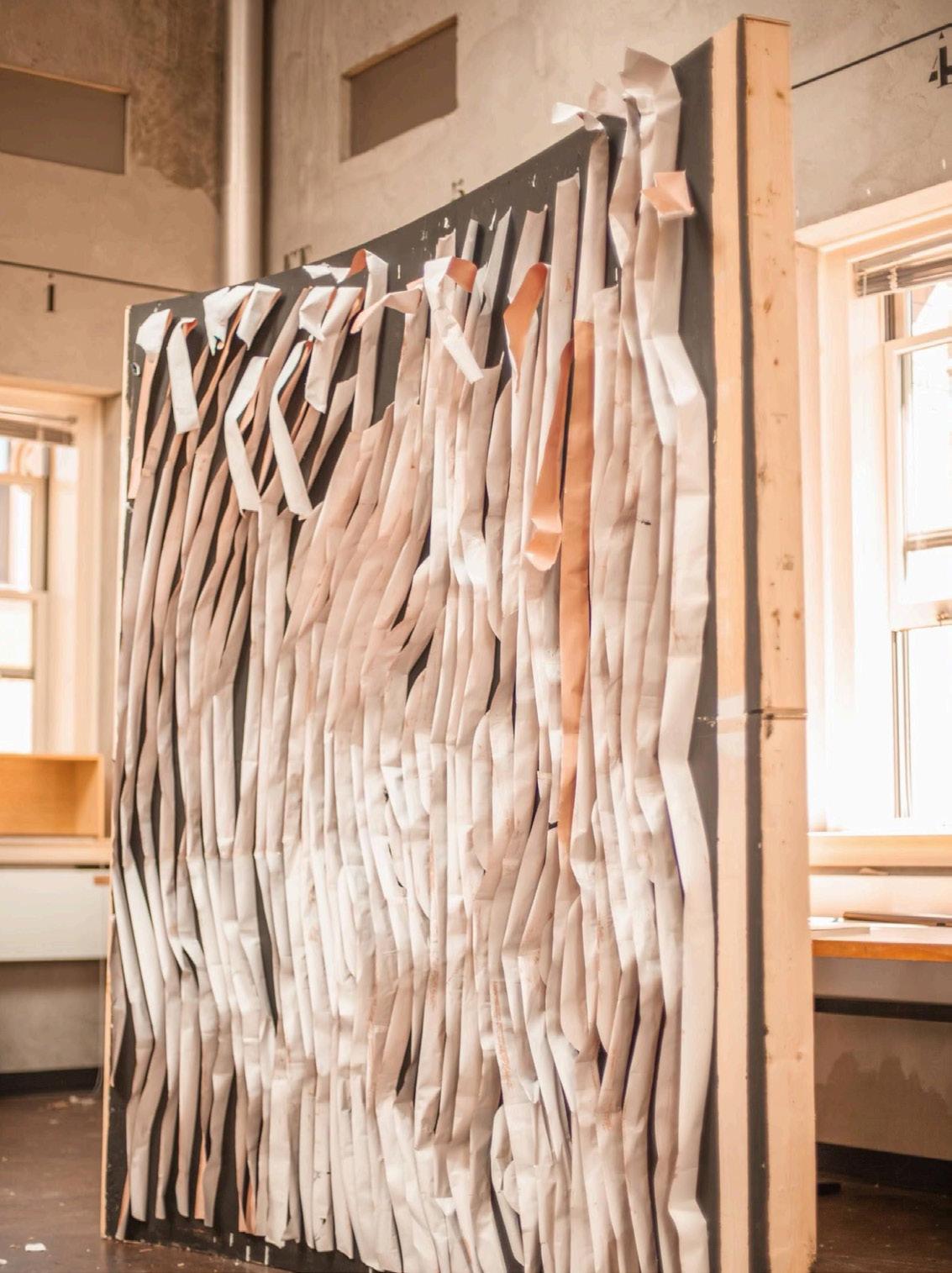 Through this design we created a floor plan of the winding wall that would work with the existing gallery, created enough space for the viewers of the exhibit and kept the fire exits clear for safety. We then designed and CNCed plywood plates that would house the 2x4 studs. These plates acted as the structure and design throughout the wall’s assembly by creating the curves needed for a smooth wall and the ability to make it stand. The wall was made of 36 different plate-2x4 units that were bolted together, stretching about 125’ in length. Once these units were in place, sheets of flexible thin plywood were attached to the studs, then a thin layer of plaster on the uneven joints to smooth out the surface for the final vinyl sheet to be assembled on top.