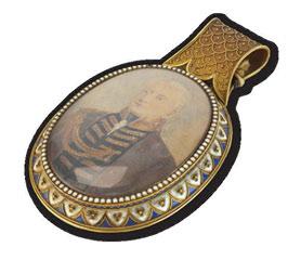 for portrait miniatures, probably by John Brogden, the yellow metal mount with blue and white enamel border set with pendant lug with rope and bead wire work embellishment, the reverse of the lug with plaque signed ‘J.B’, the pendant housing an oval miniture on card depiciting Lt-General Nicholas Nepean (Royal Navy). Governor of Cape Breton, Nova Scotia, (1757-1823), with label to the reverse ‘Under the Patronage of H.M. The Queen & Royal Family Painted by Miss Bond Oakley Place Southsea’, the pendant measures approx 87mm x 52mm (including lug).