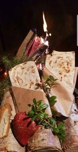 Här serverar vi vår egen lokala tunnbrödsklämma med tunnbrödet som bakas här på gården, smaksatt med lokala delikatesser & serveras direkt från hällen.