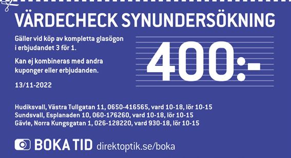 77 0651-146 60 • www.reseshopen.se VÄLKOMMEN PÅ RESETRÄFF 29-31 JANUARI TILL HELSINGFORS Fr. 1495:-/p I resans pris ingår: Bussresan t/r (60-tal orter trafikeras), del i 2-bäddshytt, kat B, insides, väl komstdrink, middagsbuffé inkl. dryck på utresan, frukostbuffé t/r, underhållning ombord & information om 2023-års resor. Välkommen till oss! Här får ditt barn vara kreativ, använda sin upptäckarglädje och problemlösningsförmåga. För mer information; www.mullemeckigladahudik.se 0650-55 66 40 Dellenlax AB • Tel 070-6587220 • www.dellenlax.com LAXFÖRSÄLJNING I NORRBO Följ oss gärna på Facebook! Vi kör samma pris som förra året! Över 10kg 99kr/kg Under 10kg 110kr/kg Öppet: lördag och söndag kl 10-15. Från 17 sept. - 6 nov. Förbeställ gärna vid köp av större mängd färsk fisk och hämta efter kl 13 så undviker vi trängsel. Välkomna! Reservation för slutförsäljning. Färsk direkt från brygga FABRIKSFÖRSÄLJNING