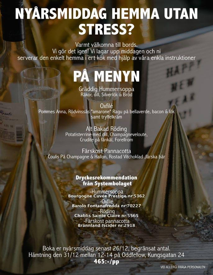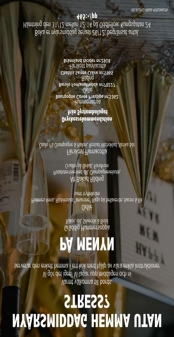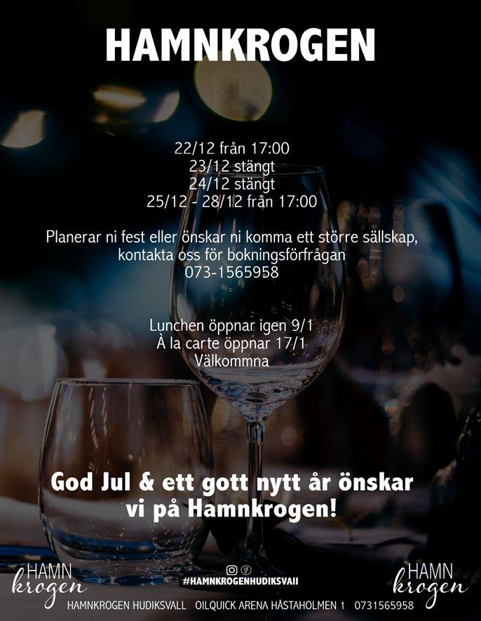 75 sedan 1981 0651-146 60 • www.reseshopen.se Välkommen att resa med oss! 29/1 RESETRÄFF PÅ SILJA SYMPHONY 3 dgr från 1 495:- boka senast 30/12 Bussresa t/r, del i 2-bäddshytt, insides, välkomstdrink, buffé inkl. dryck på utresan, frukost t/r, underhållning & information om 2023 års resor. KRYSSNINGAR TILL TALLINN ELLER HELSINGFORS 3 dgr från 2 095:9/1, 26/2, 12/3, 26/3, 7/5, 21/5, 4/6 & 18/6 Bussresa t/r, del i 2-bäddshytt, insides, buffé inkl. dryck på utresan, frukost t/r, underhållning ombord, bussen med över till Tallinn. 12/2 MÅ BRA PÅ SPA I TALLINN 5 dgr fr 5 295:bokar du före 30/12 ingår 2 behandlingar Bussresa t/r, del i 2-bäddshytt, insides, buffé inkl. dryck på utresan, frukost t/r, 2 nätter, del i dubbelrum, inkl. frukost, på Tallink SPA & Conference hotel, bussen med över till Tallinn. 4/2 KRYSSNING I VÄSTRA KARIBEIEN 9 dgr från 19 995:- 4 platser kvar 24/2 MUSIKALEN HAIR 3 dgr från 3 795:- 8 platser kvar 22/4 KANALKRYSSNING AMSTERDAM-ANTWERPEN 5 dgr från 12 495:12/5 COSTA BRAVA MED BARCELONA 8 dgr från 13 495:2/9 KRETA 8 dgr från 10 985:7/10 LAS PALMAS 8 dgr från 9 995:Knåda Sport 0271-34075 Lååångöppet FREDAG 16e December KL 8 - 22 Ni som handlar under hela dagen/kvällen är med och tävlar om två presentkort à 1000kr 20% På ny slalomutrustning/tillbehör gäller den 13dec - 23dec OBS. Ej på redan nedsatta priser Från kl 18 bjur vi på körv mä brö å glögg! Läs mer och boka på vår hemsida. Där finns även andra kurser & kurstillfällen. Söderhamn 20/12 Hudiksvall 16/1 Edsbyn ........................................ 27/2 Ljusdal ......................................... 16/12 Ring 070-930 63 60 eller maila info@bfmitt.se för mer information. www.bfmitt.se HETA ARBETEN UTBILDNINGSDAGAR: Brandskyddskontrollant-SBA Distans 14/12 0650-107 77