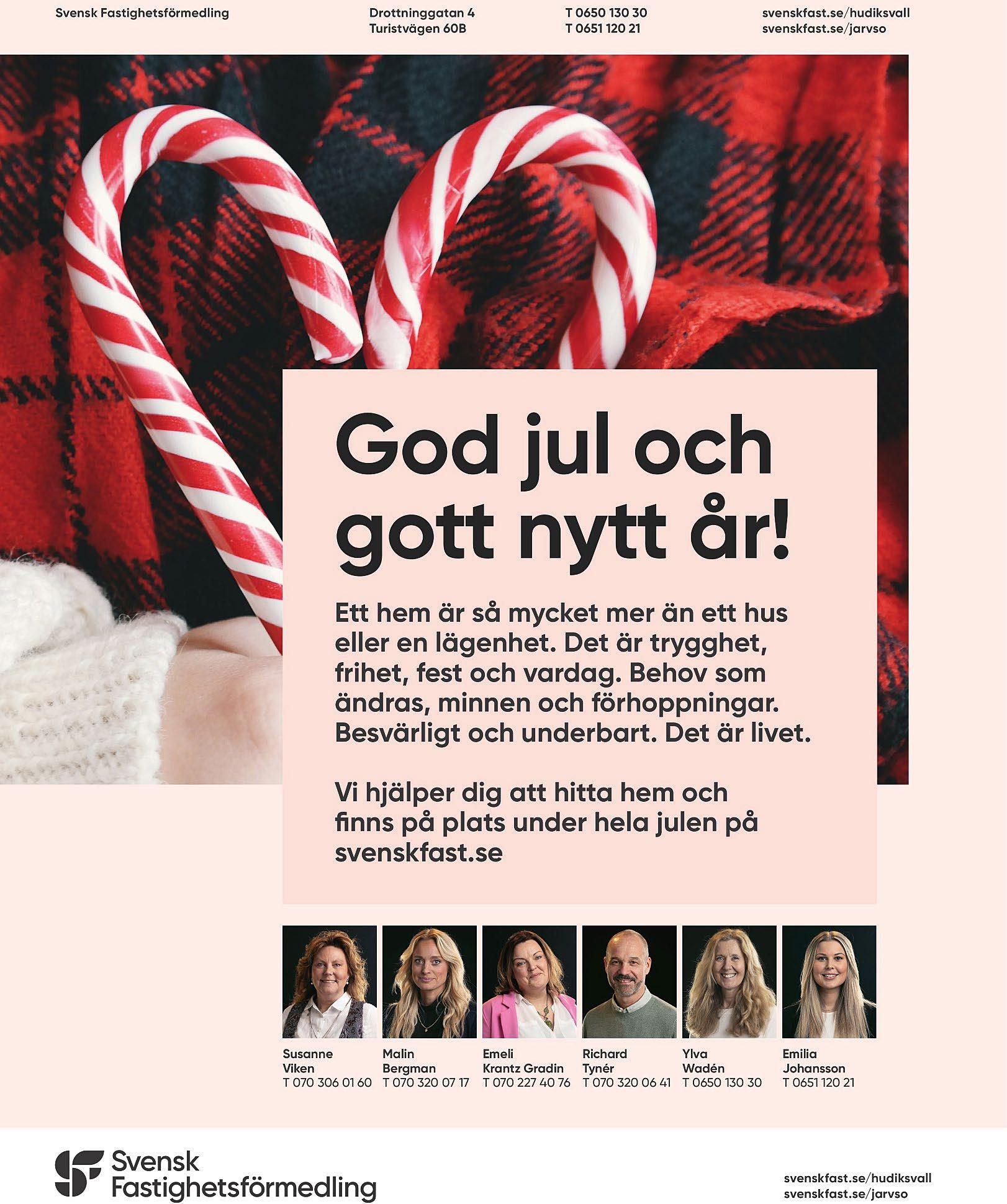 Med önskan om en välsignad jul och ett Gott Nytt 2023 Kontakt: 0650-54 07 84 Olof Bromansgata 8 824 43 Hudiksvall www.svenskakyrkan.se/hudiksvallsbygden Vi finns även på Facebook Klipp ut och spara OBS Annonsen flyttar till Hudiksvalls Tidning & Helga från och med januari 2023