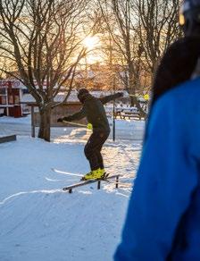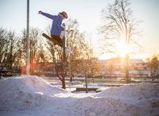 Foto: Sabina Wixner Måns Österdahl slänger en mute-grab i motljus, eller för oss som inte kan det där med tricks, en ”korsade-skidor-med-handenpå-hopp”. Joel Mårtensson testar parken som nu ligger vit. i Hudiksvall har bytt skepnad och ger under vintern Foto: Alicia Mårtensson Åkare: Joel Mårensson. Trick: Blunt.