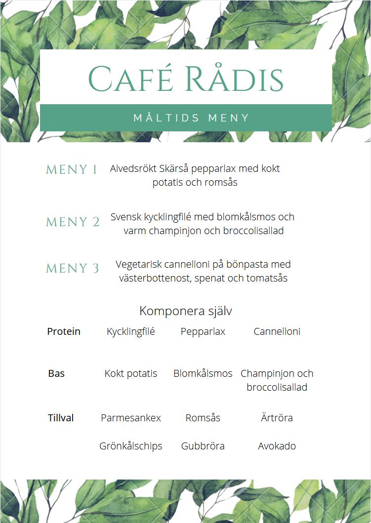 All mat och fika finns för avhämtning, annars är ni självklart välkomna i våra rymliga lokaler! Möjlighet finns att boka eget rum för t ex möten. Beställning via sms till 076-112 2457 eller mail radis.soderhamn@gmail.com