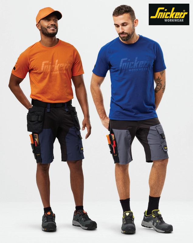 Combining 4-way softshell stretch fabric with sustainable Sorona 2-way stretch fabric, Snickers Workwear’s new Work Shorts feature windproof sections plus ventilating areas for enhanced comfort and freedom of movement With bodymapping designs that deliver superb functionality, the shorts come in range of stylish colour ways to complement the new ‘street smart’ 100% Cotton Logo T-shirts www.rdr.link/mbd059