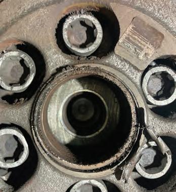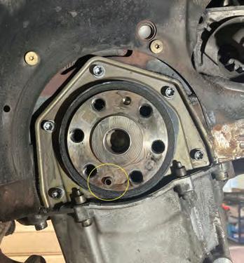 Remove the six clutch bolts and the clutch assembly. Upon inspecting the dual-mass flywheel (DMF), it was found that the center bearing had worn out (Fig.7), so the DMF also needed replacement. Remove the DMF bolts and inspect for leaks, cleaning as needed. Remove the old CSC, clean out the bell housing, and fit the new CSC. Torque the two retaining bolts, apply a small amount of high melting point grease on the gearbox input shaft splines, and slide the new clutch plate up and down the splines to distribute the grease evenly.