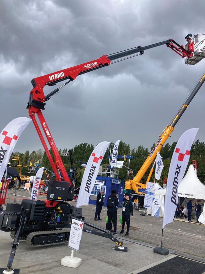 Hinowa models, most notably the 40m 40.18 tracked spider and smaller sibling the 26.14. Next door Promax Access featured the brand-new Platform Spider 54T. With a 54m working height and 20m outreach, it features a four person, 400kg cage capacity, an OEM 125kg cage winch and optional 1000kg hoist attachment for heavy-duty lifting. At the other end of the scale the new, nifty and slimline Spider 18.95 has a working height of 19.6m, a maximum outreach of 9.6m and a safe working load of 230kg. With radio control and a hybrid option, the model should lend itself to many applications.