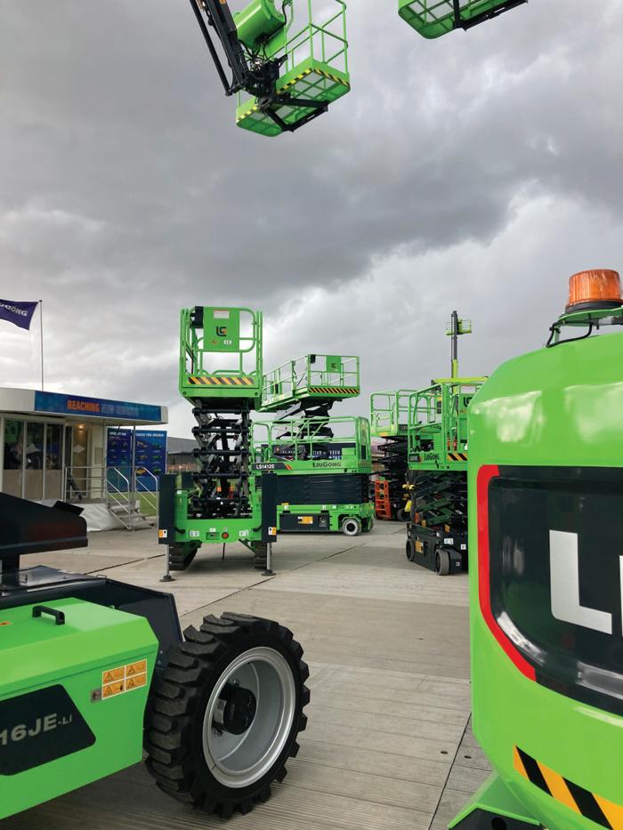 The green liveries of Liugong machinery stood out as the Chinese OEM displayed a raft of kit from its aerial work platform range including the 11.2m LM09JE mast boom, making its UK debut. It offers 3m of outreach and 200kg platform capacity. Alongside was parked another new model, the 19ft LS0608E that comes with a 7.8m working height.