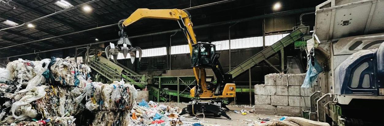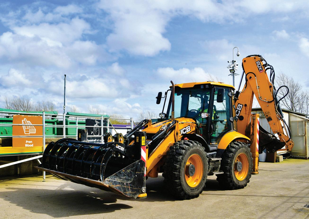 Using a jaw bucket attachment on the back actor, the backhoes can pick, sort and compress the waste within a container – fitting more waste in each and reducing the number of container collections needed to process the recyclable material. They also move containers using an integrated skip hook at the front end and with their roading capabilities, they can operate across all five sites in Wales.