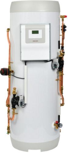 The stainless steel cylinders are lightweight, include an indoor hot water tank and control system and come pre-plumbed and pre-wired to be paired with an outdoor air-source heat pump.