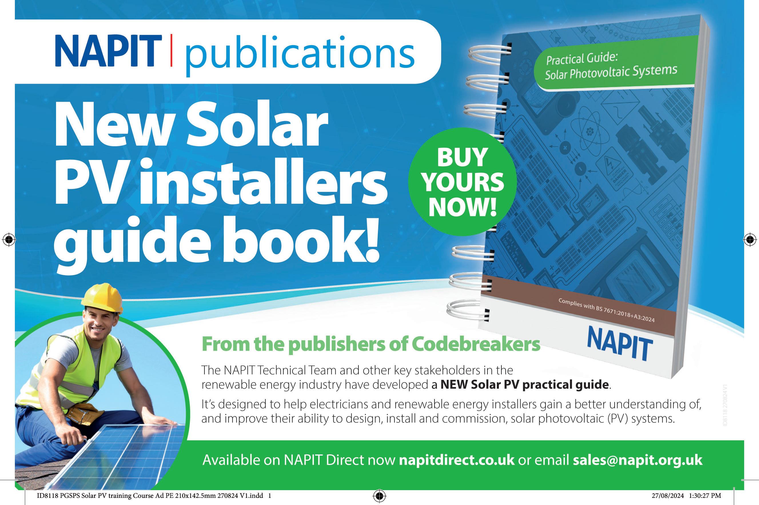 The latest NAPIT publication, NAPIT Practical Guide: Solar Photovoltaic Systems, is now available to purchase The guide has been created to assist electricians and renewable contractors with a practical understanding of Solar Photovoltaic (PV) systems including design, selection, installation and commissioning of Solar PV Systems The new publication, available digitally and in hard copy, provides practical guidance of maintenance and fault finding of Solar PV systems, using a simple approach to finding the faults that may occur and how to rectify them From the concept of designing a Solar PV System, the guide covers expected performance, PV Self consumption and grid independence to the array mounting and roof interactions and on to the cable type, location, connections and inspection and testing By including reference to health and safety, Wiring Regulations, British and Harmonised standards and industry guidance the Practical Guide: Solar Photovoltaic Systems brings all the renewable installer requirements together in one publication
