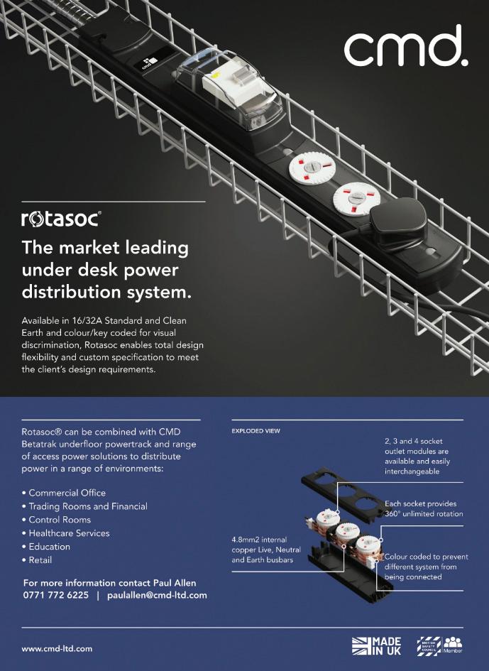 Available in 16/32 A standard and clean Earth and colour/key coded for visual discrimination, Rotasoc enables total design flexibility and custom specifications to meet a client’s exact design requirements. This latest selection of adverts pushes the benefits of the system, which can be combined with CMD Betatrak underfloor powertrack and range of access power solutions to distribute power in a range of environments.