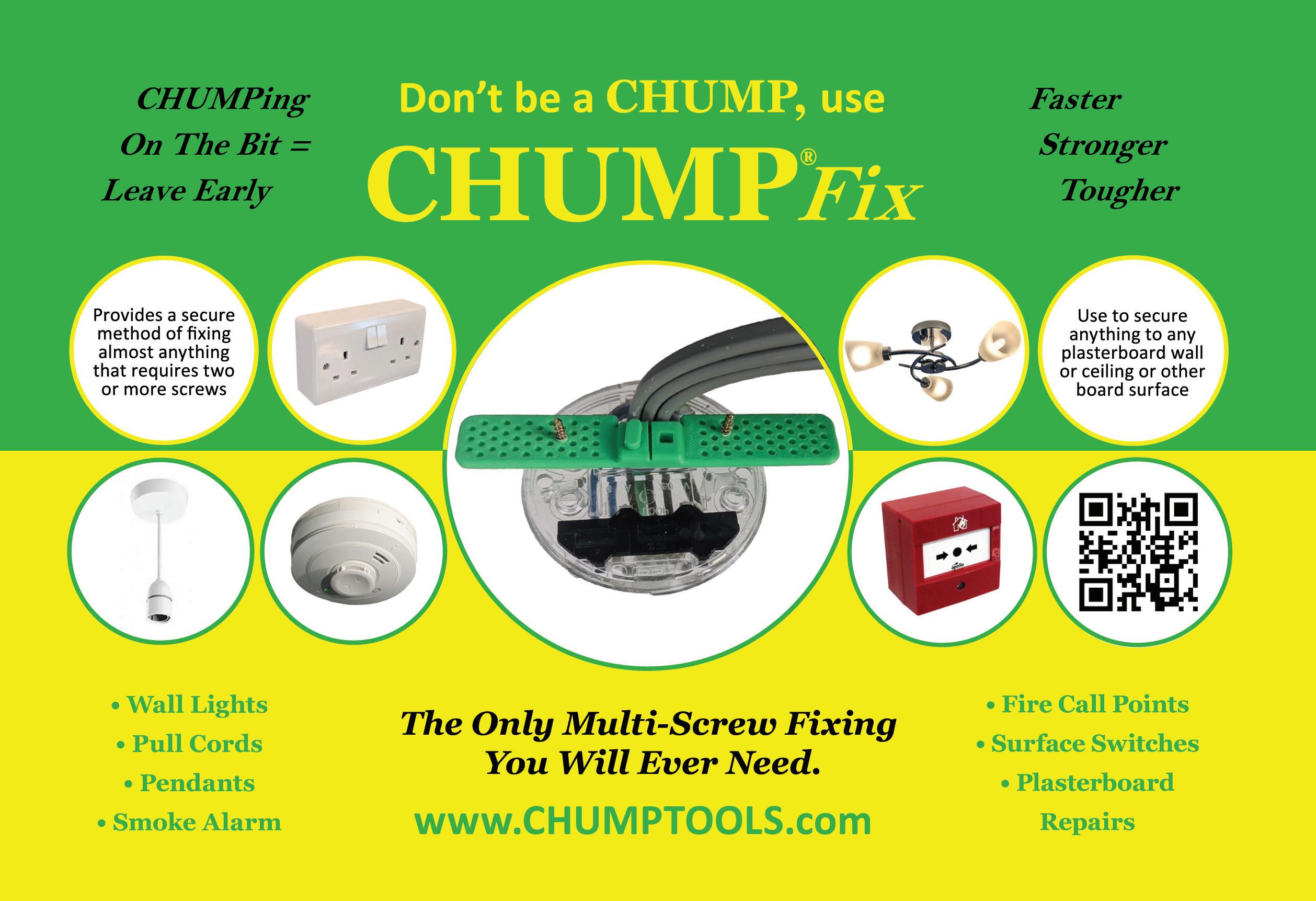 Launched last month, CHUMPFix is a first of its kind product, being the only tool to provide a secure method of fixing anything that requires two or more screws, while simultaneously re-enforcing the plasterboard. It can be used in the installation of pendants, smoke alarms, chandeliers, lights, pull cords, surface sockets, fire call points and much more. With no requirement for drilling holes for plugs, CHUMPFix spreads the weight of the fitting across a large area of plasterboard, ensuring there’s no risk of plasterboard failure caused by drilling near to the edges of board. A high-quality fixing with exact specifications for precision installation and maintenance processes, CHUMPFix is manufactured in the UK with ISO9001 quality assurance.