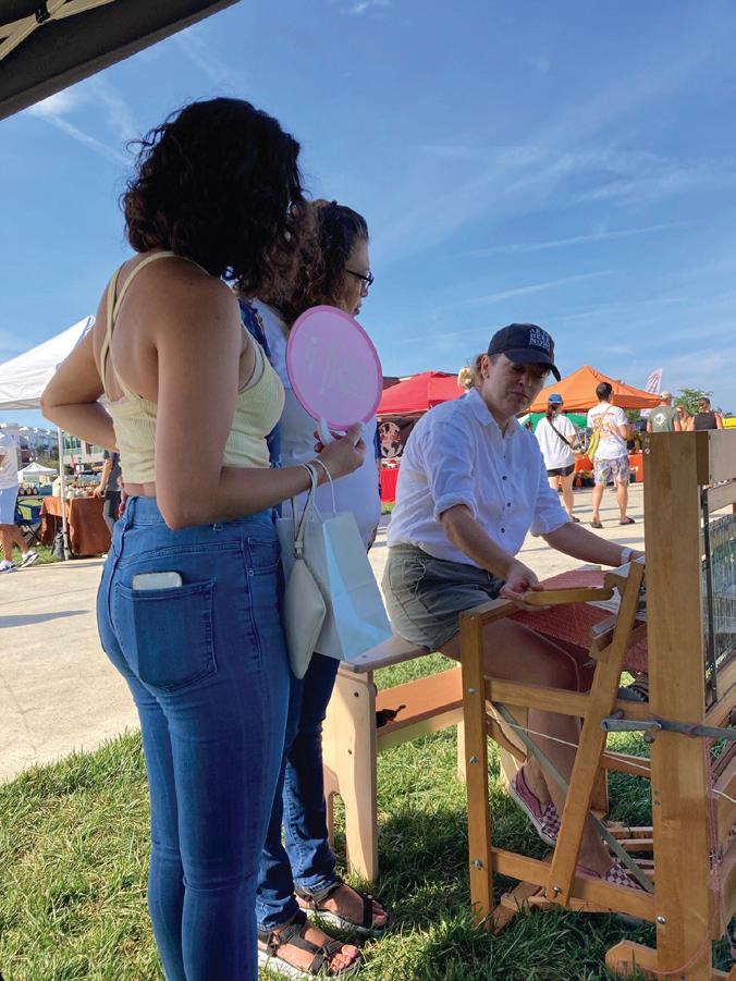 farmers markets, showcasing their art, which invites marketgoers to ask questions. Maker-in-Residence Megan Benson brought her loom to the market and a staff member observed, “Seeing the loom brought up nostalgic feelings in many of the older marketgoers. Grandparents would stop with their grandchildren and talk about memories of a loom in the home and items they had grown up with that were woven...one young boy spent a considerable amount of time asking questions about the workings of the loom, watching Megan press the treadles and run the shuttle through. She then let him try it on his own. People’s faces lit up just watching Megan work.”