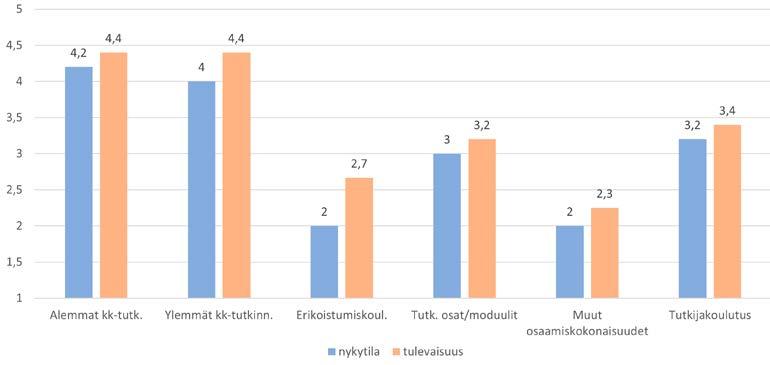 13. Millaiseksi arvioitte seuraavien toteutusmuotojen merkityksen koulutuksen toteutuksessa tulevaisuudessa (3-5 vuoden kuluessa)?