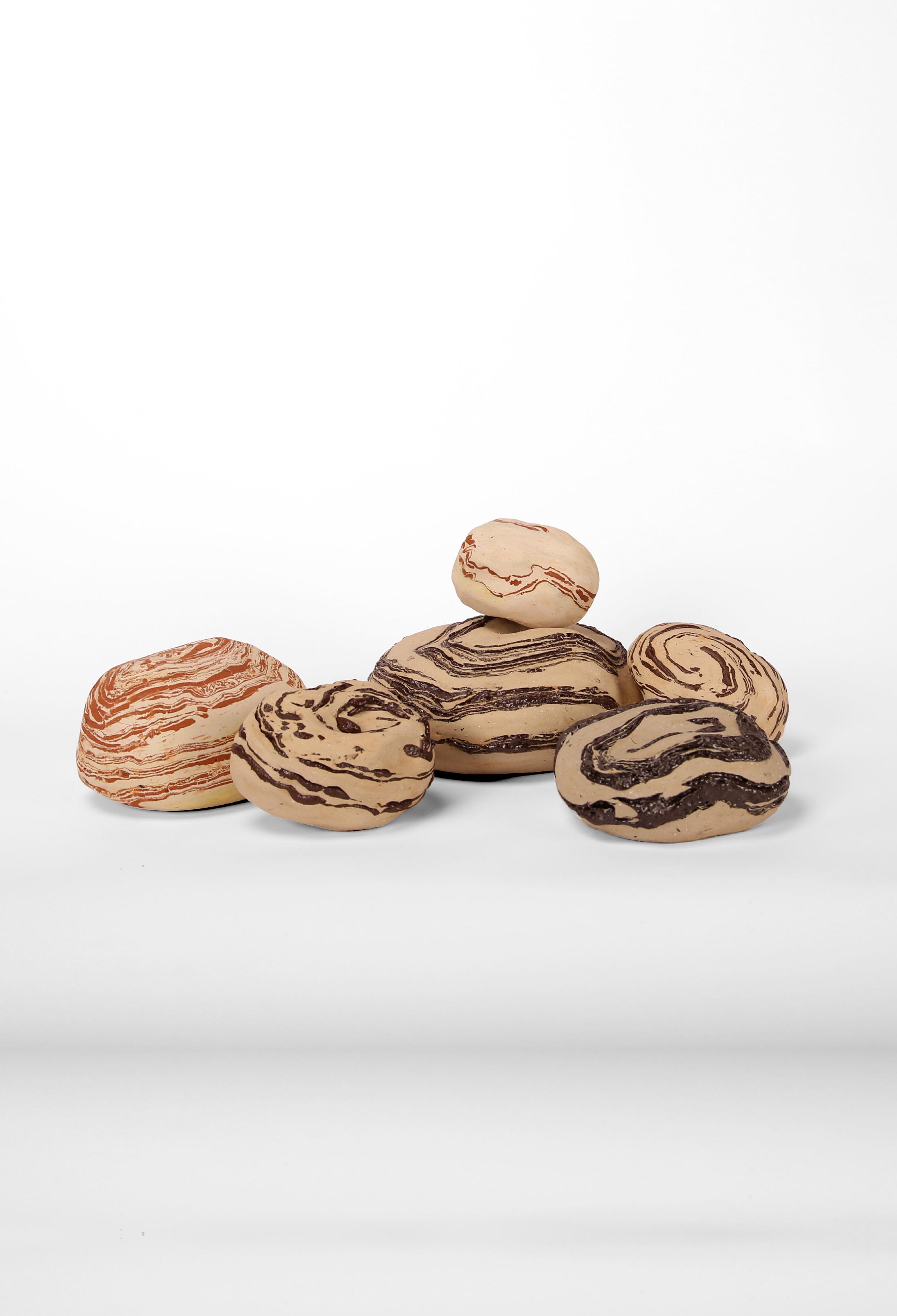 The layered stones and glass stones were created as a course assignment, where the task was to make a piece from local materials. I defined local to encompass the campus area. The materials used in the works include waste glass from glass students, wild clay dug up from the campus yard, and recycled clay made at the school.