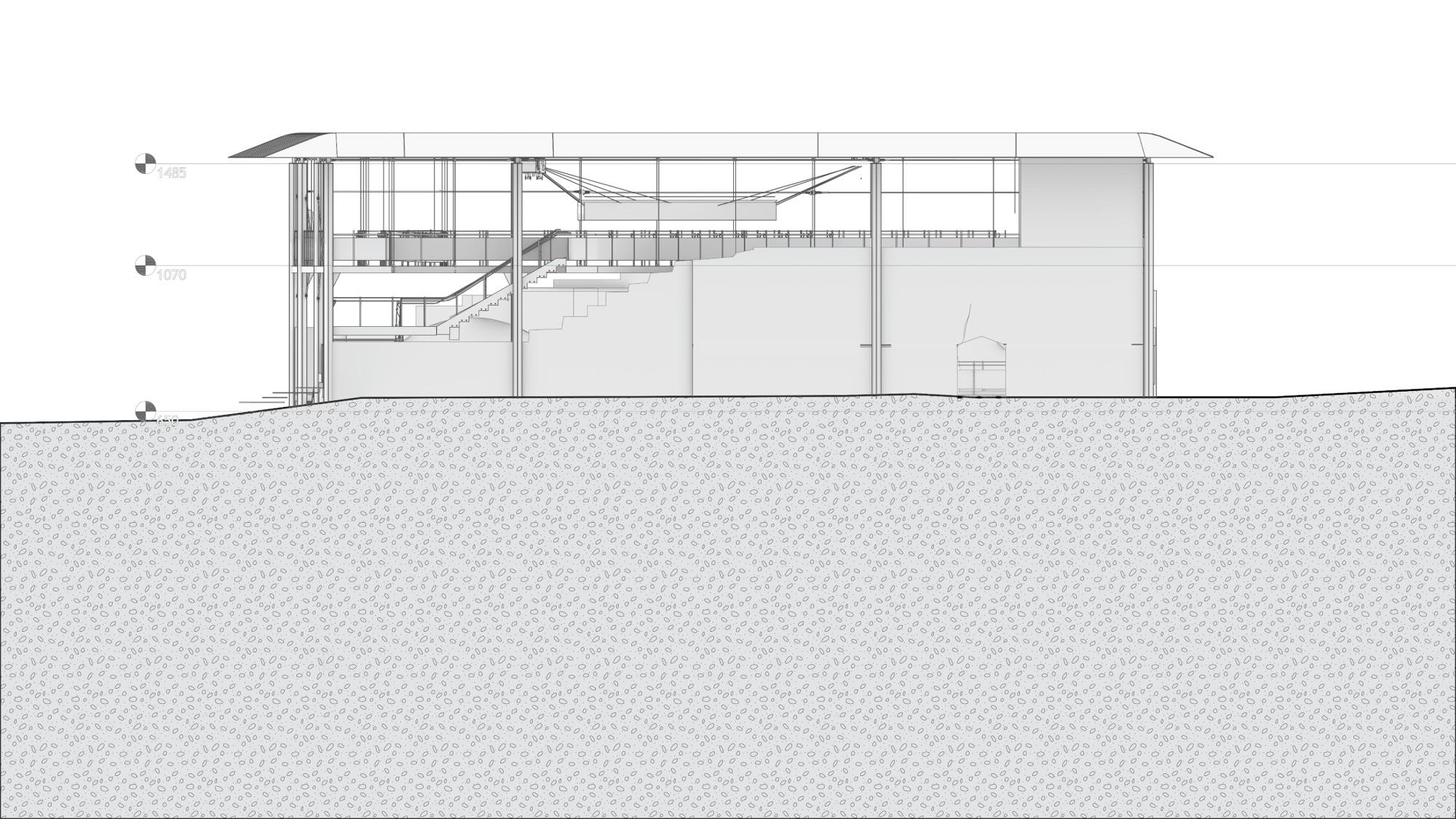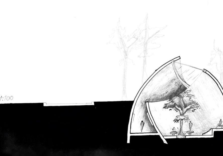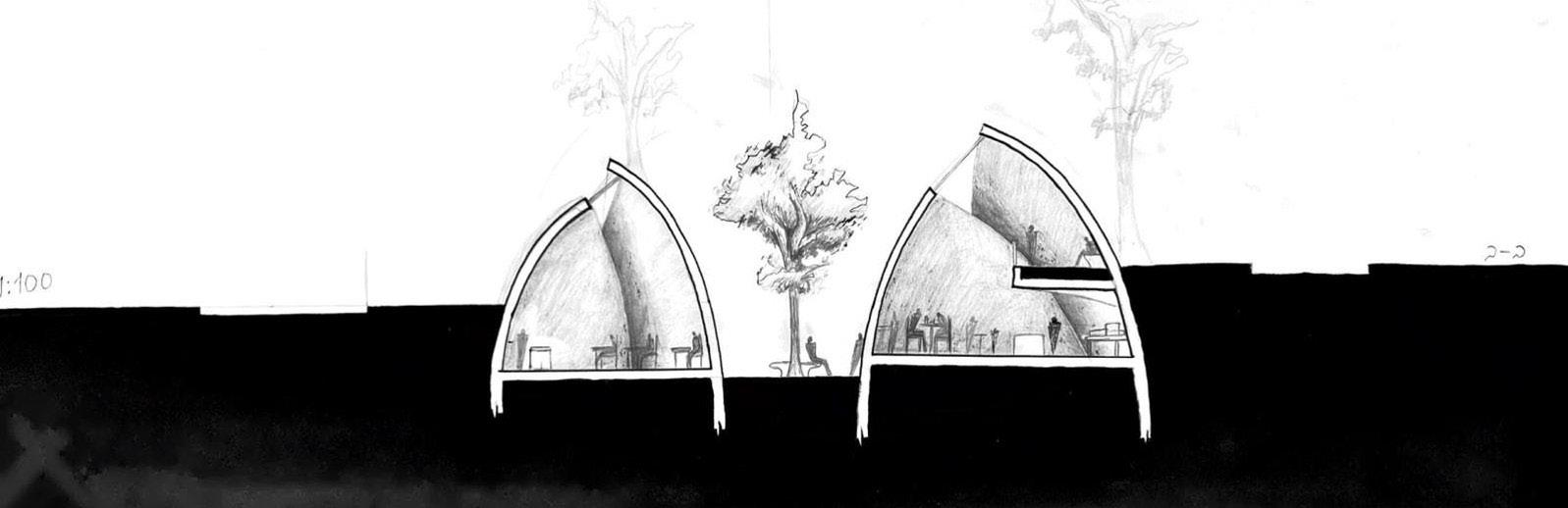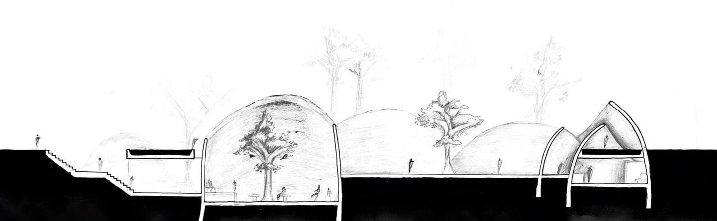 Rather than impose geometry onto Ezer Park, this project treats the existing vegetation as the primary architectural system. Trees become columns, their canopies become roofs, the spaces between them become rooms. The building does not arrive on the site. It grows from it.