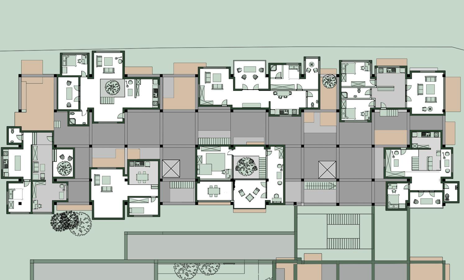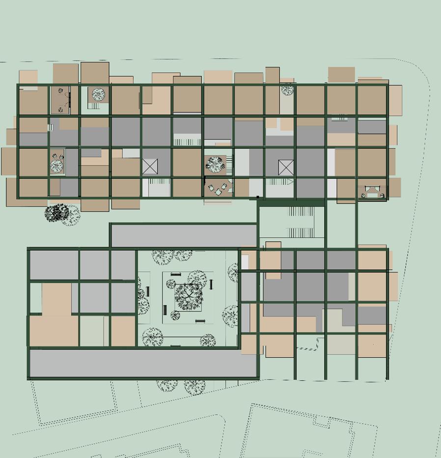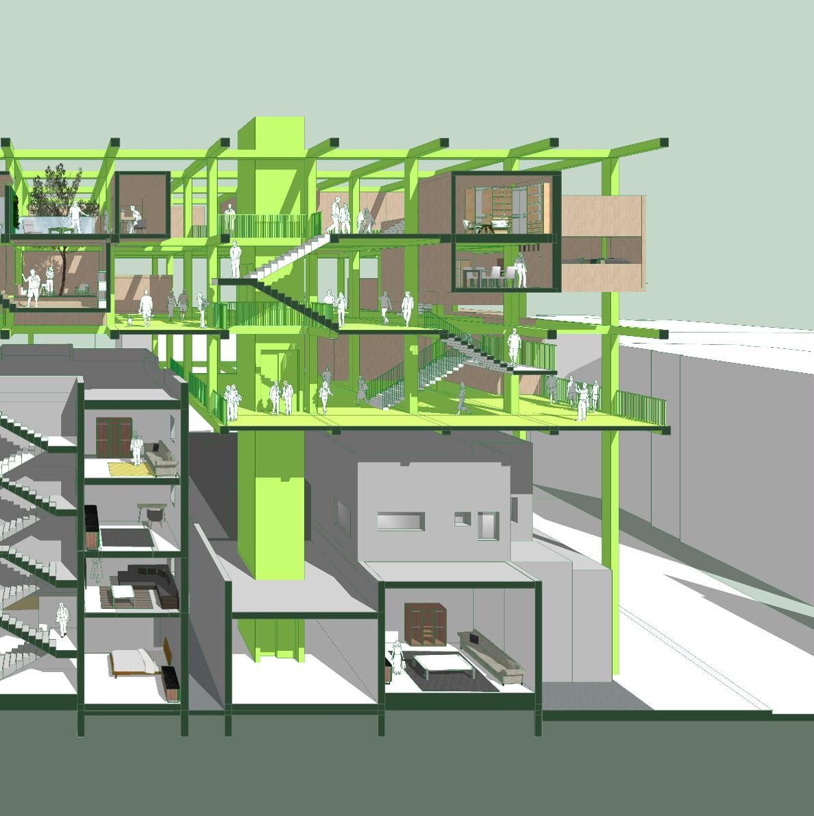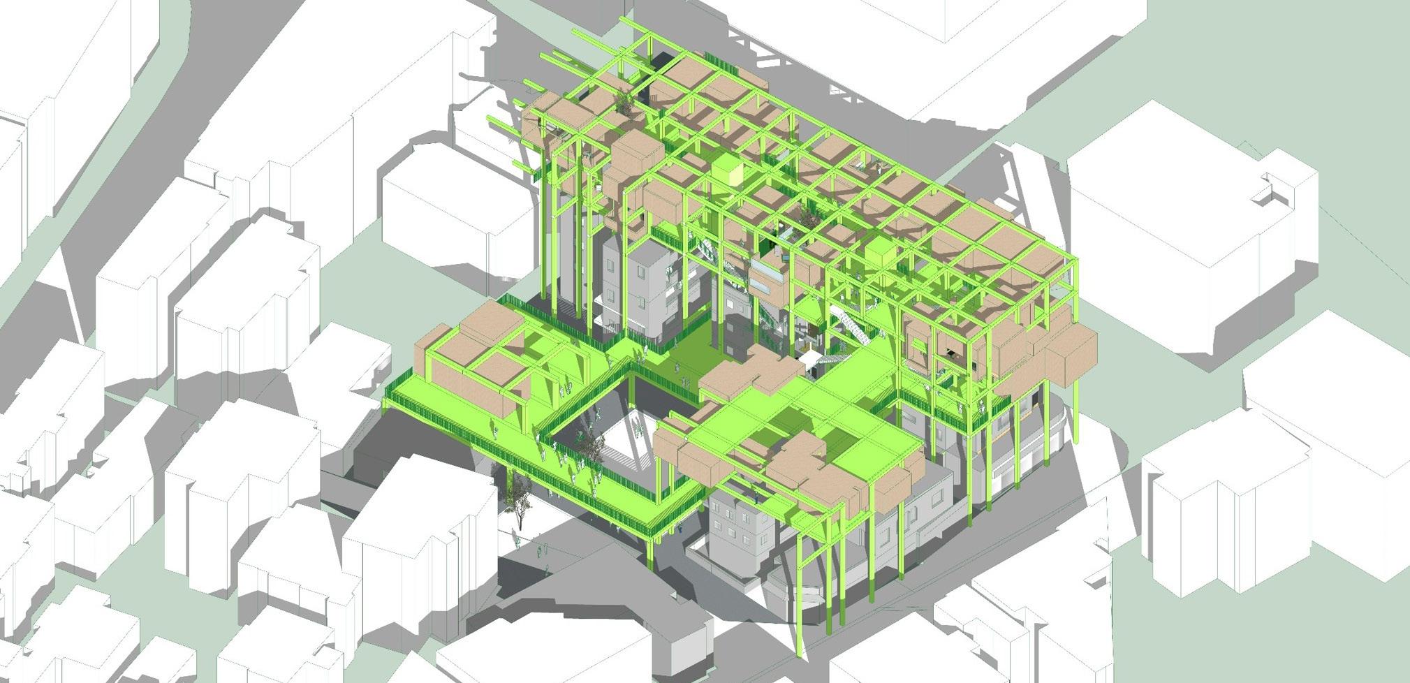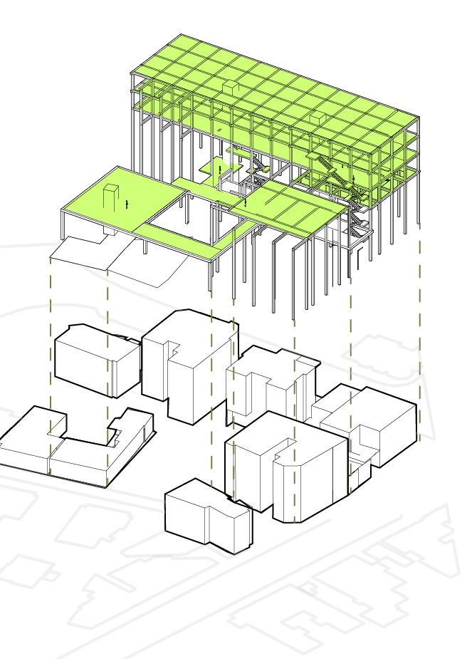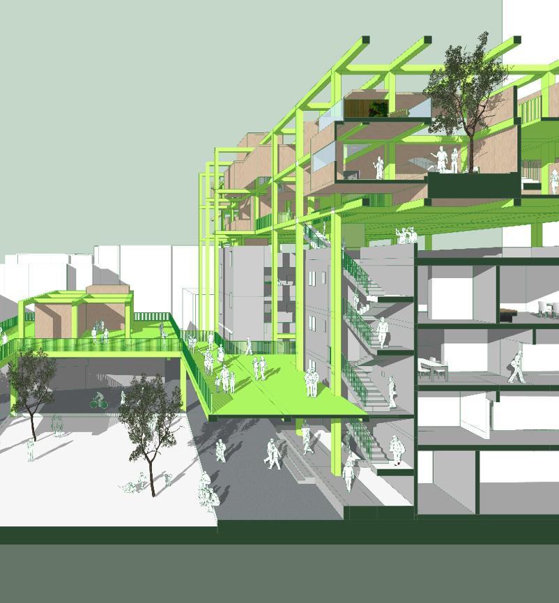 The proposal introduces a structural steel grid — a skeleton — that operates simultaneously at three scales: between old and new buildings, through the public passages that thread the urban block, and inside the housing units themselves. The framework does not determine how people live. It makes more ways of living possible.