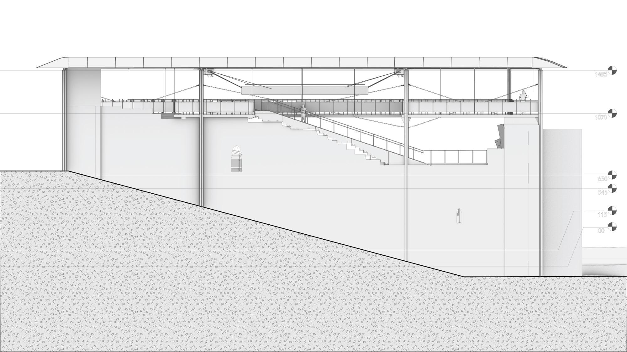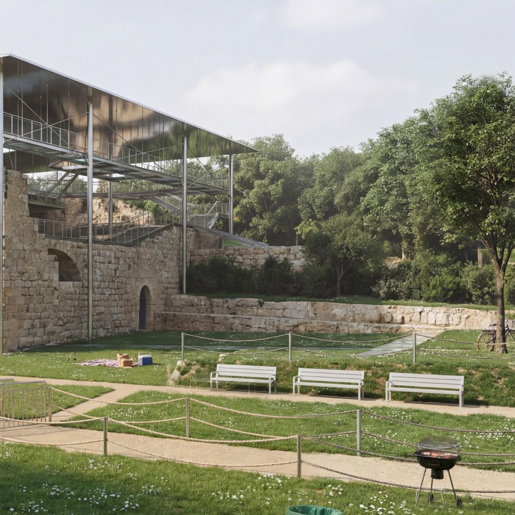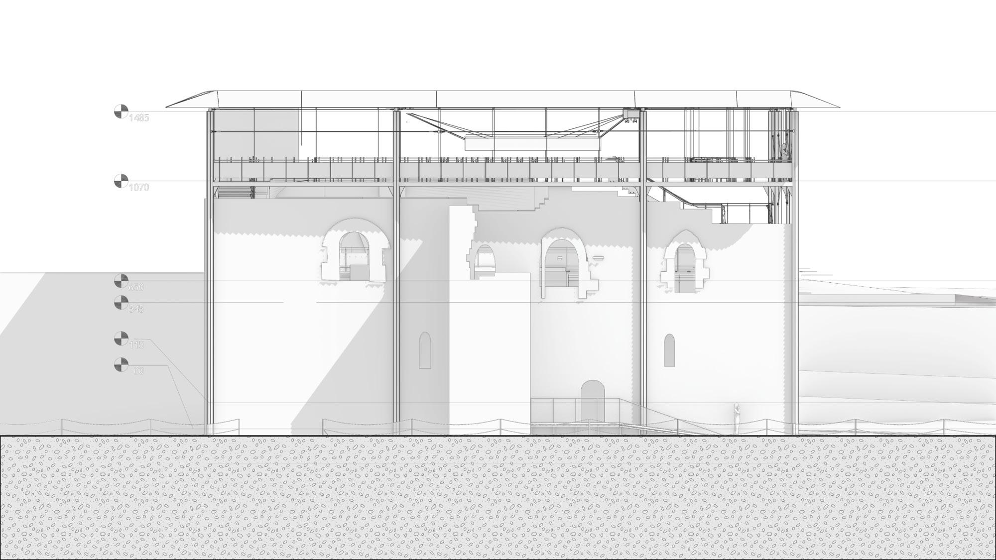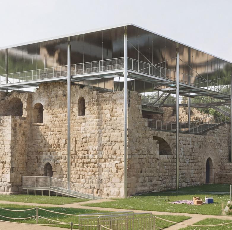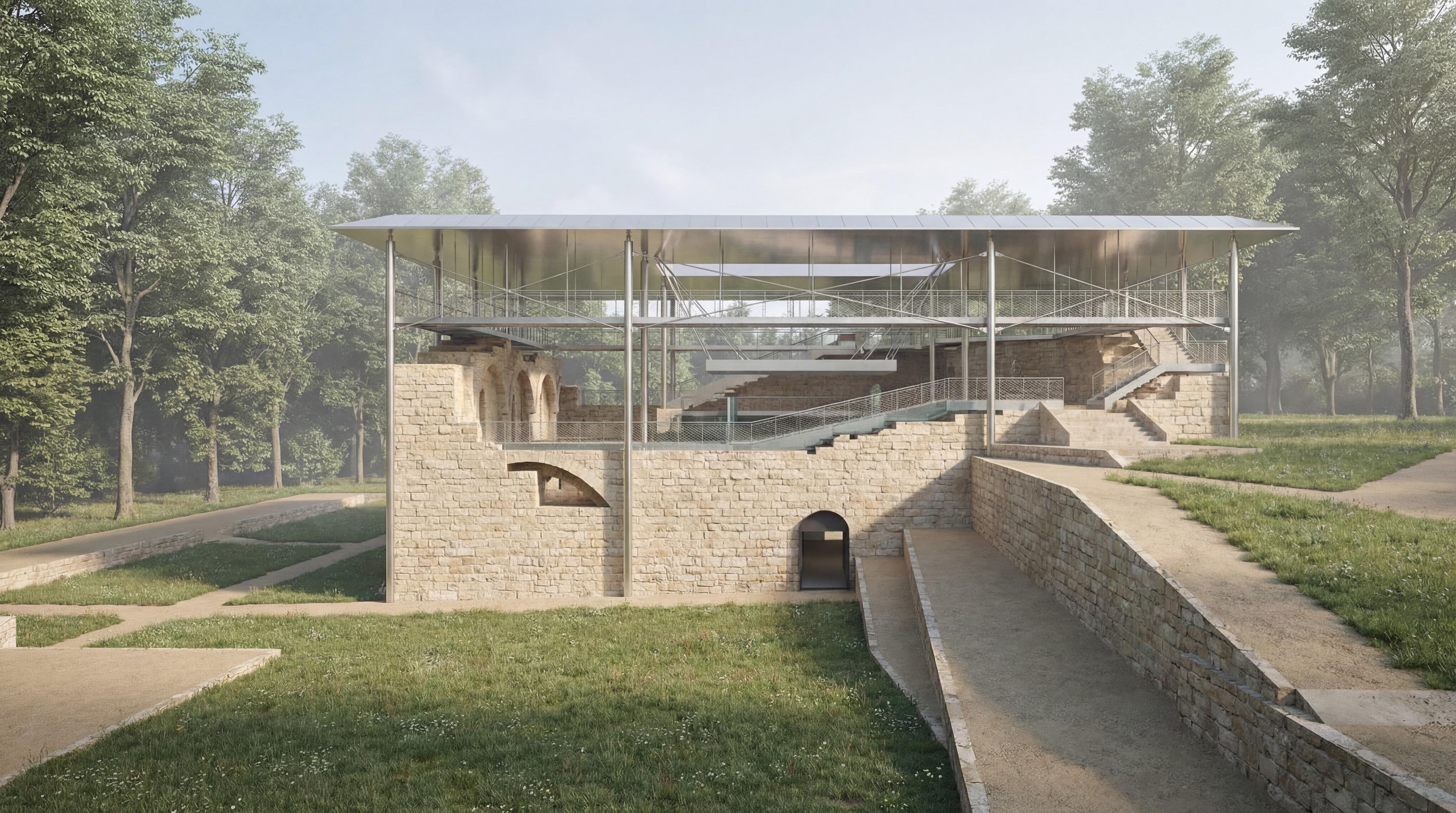 Rather than imposing new form onto old stone, the architectural language emerges from the site itself: a steel and glass canopy that hovers above the medieval walls, transparent enough to reveal, precise enough to reframe. The intervention does not compete with the ruin. It completes it.