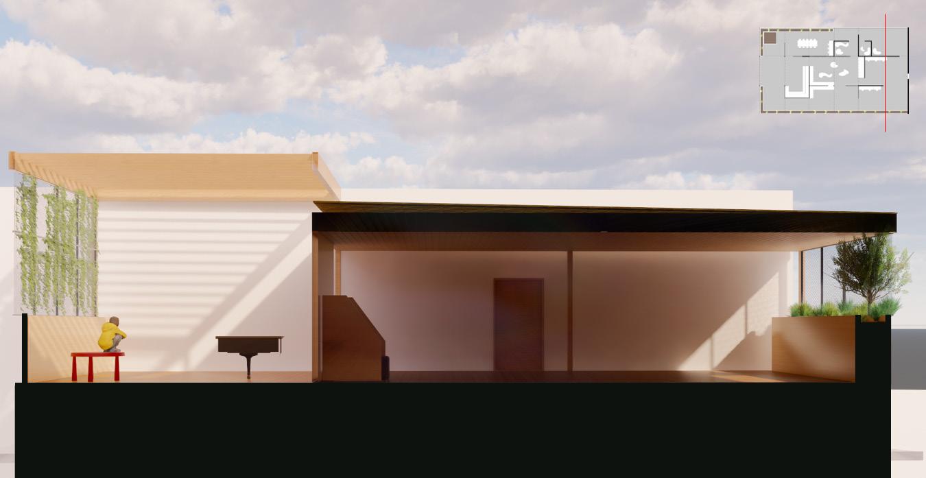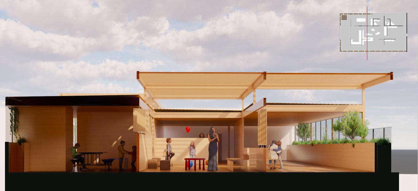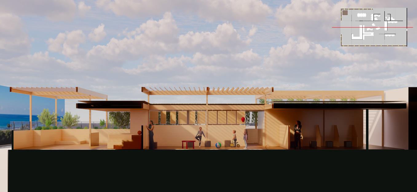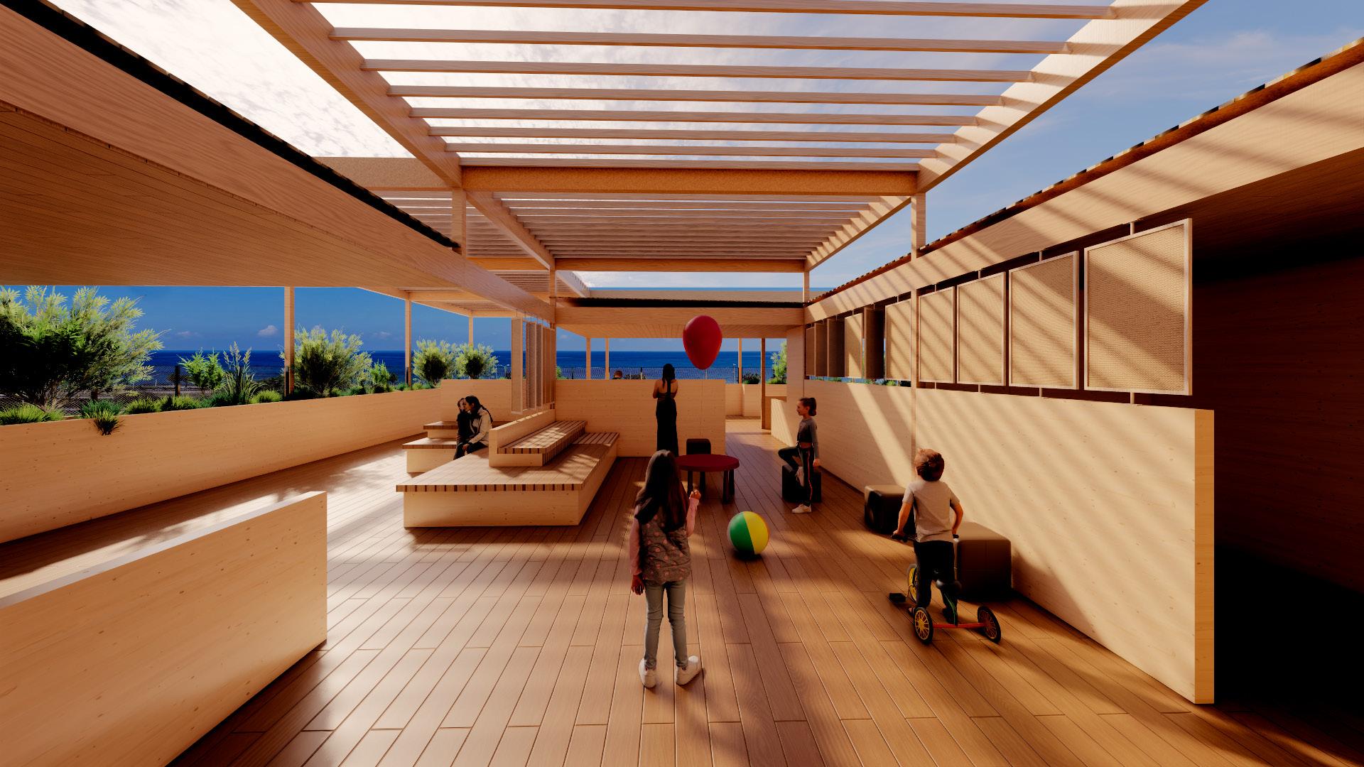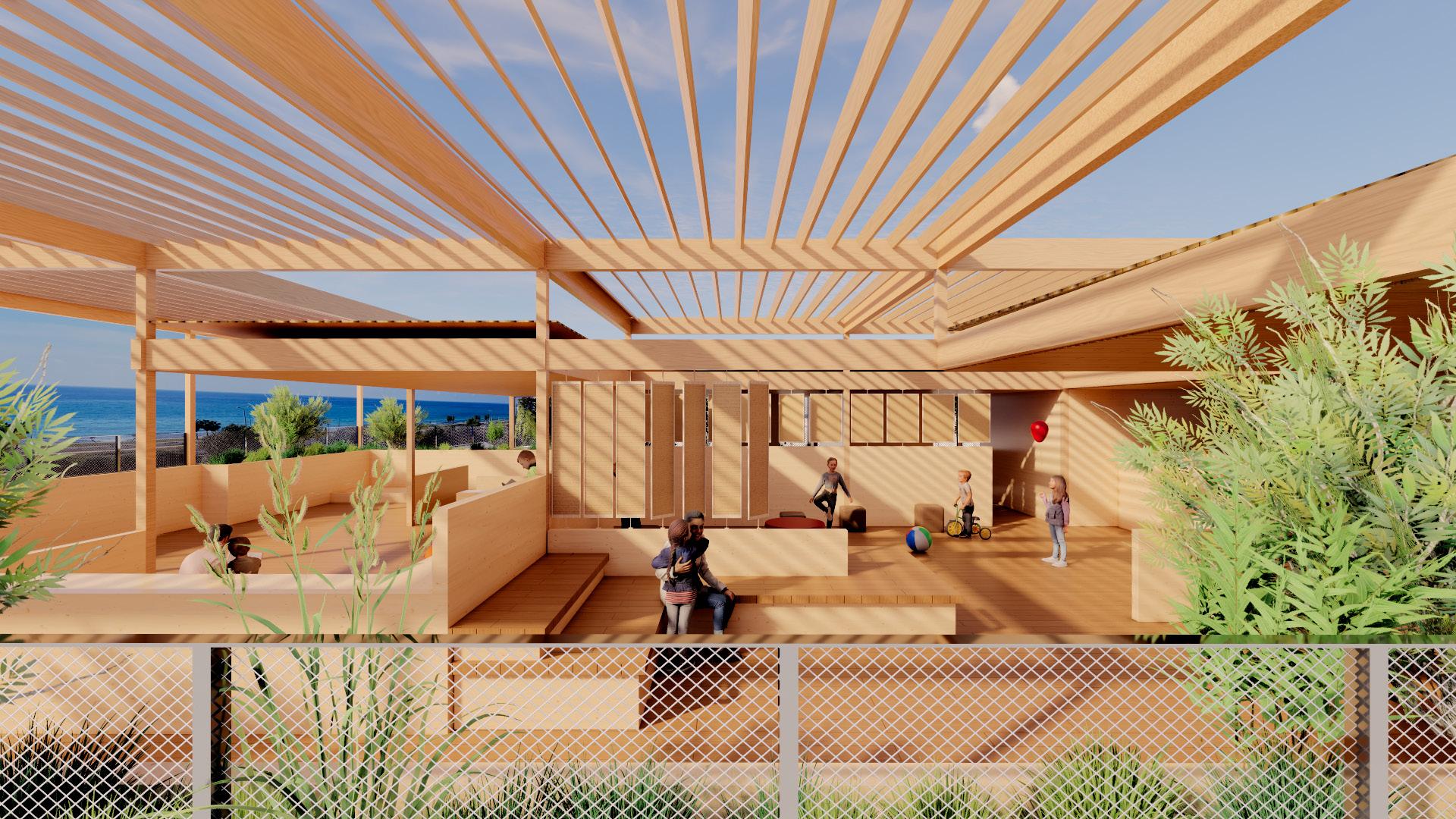 Working directly with educators, therapists, and the school community, the project identifies what autistic children actually need from space: gradual transitions between stimulation and calm, clarity without rigidity, environments that support regulation rather than demand it. The architectural proposal translates these needs into a sequence of flexible outdoor and semi-enclosed spaces — a timber structure with filtered light, adjustable enclosure, and a sensory garden overlooking the sea.