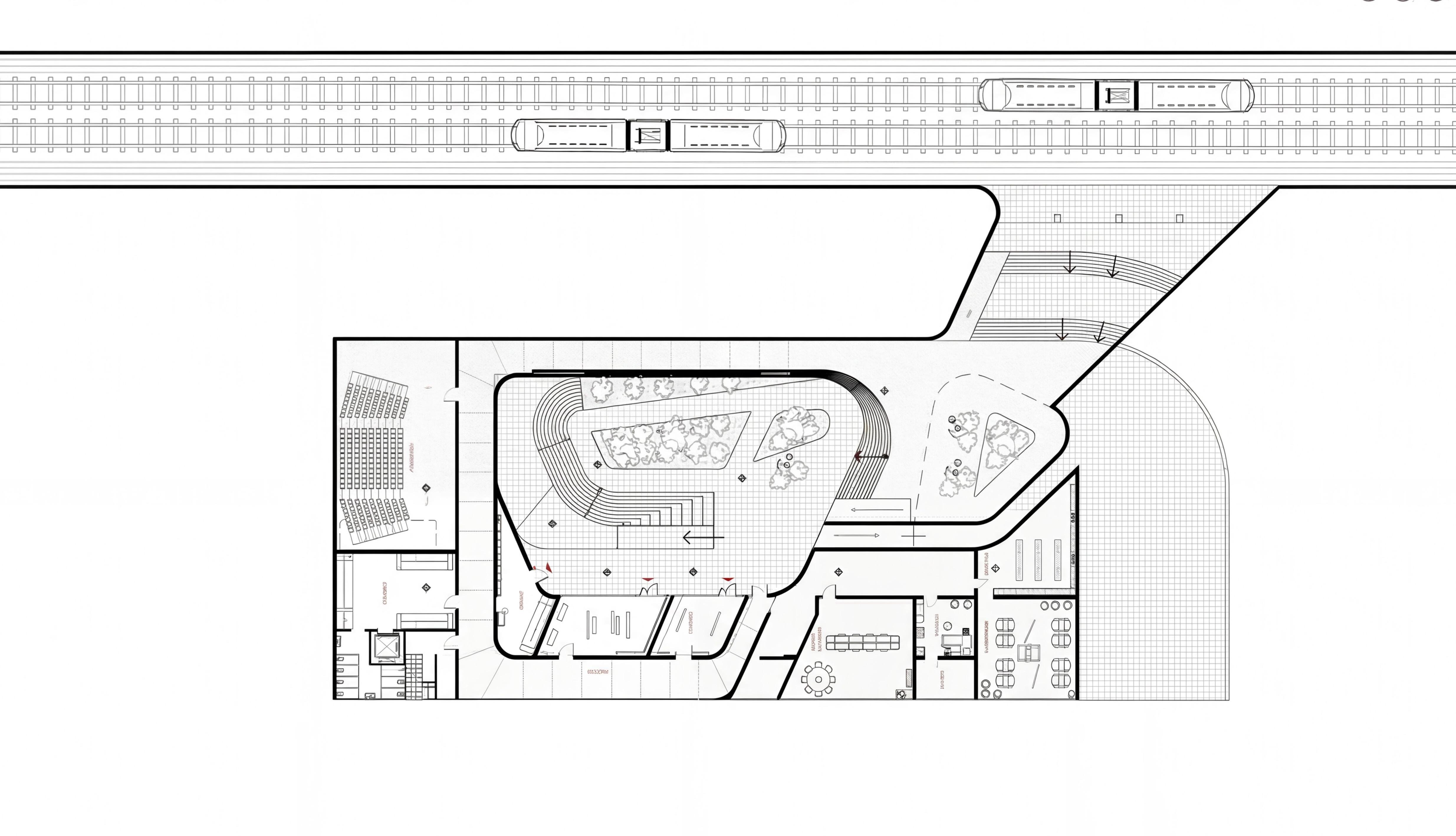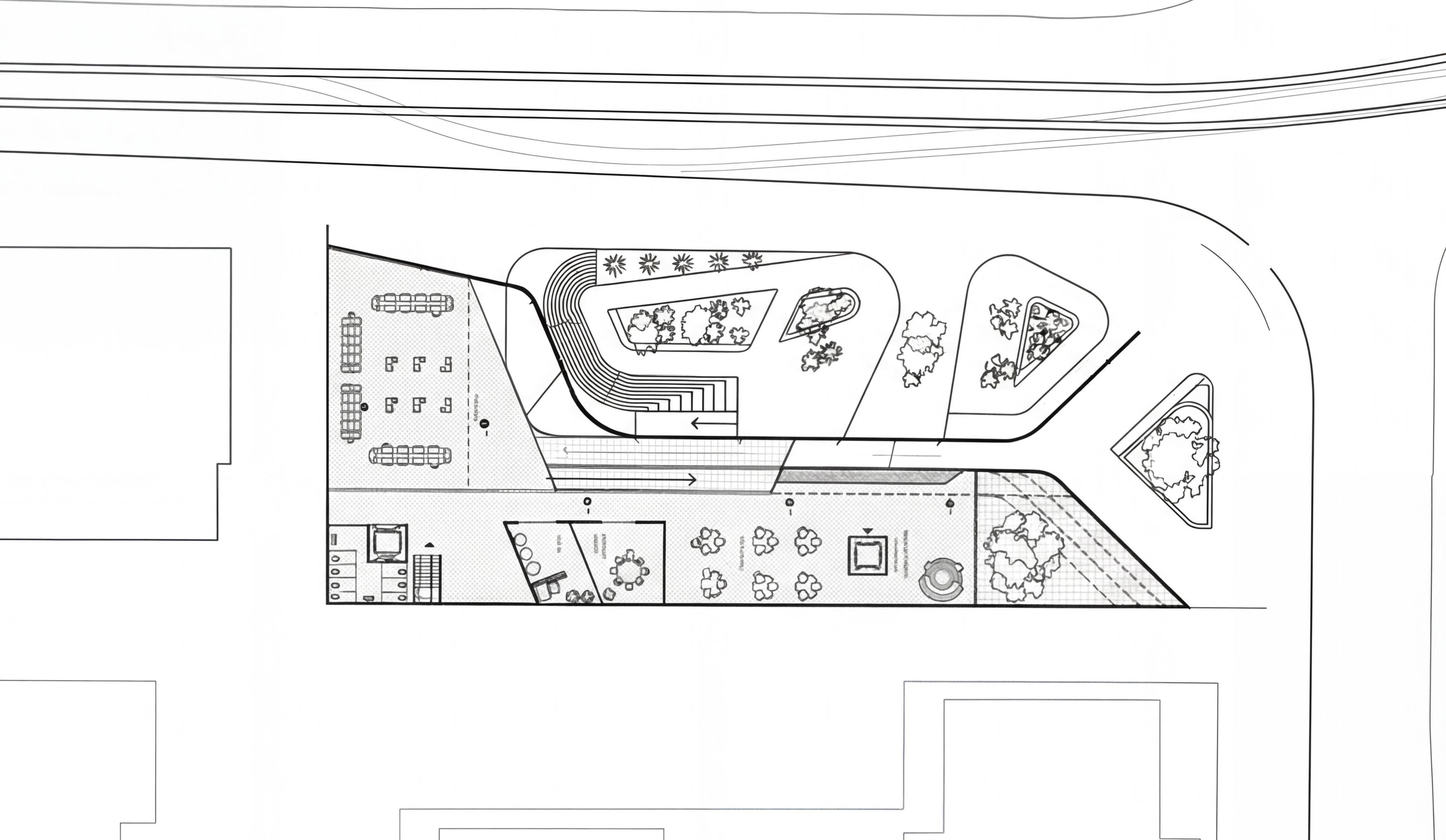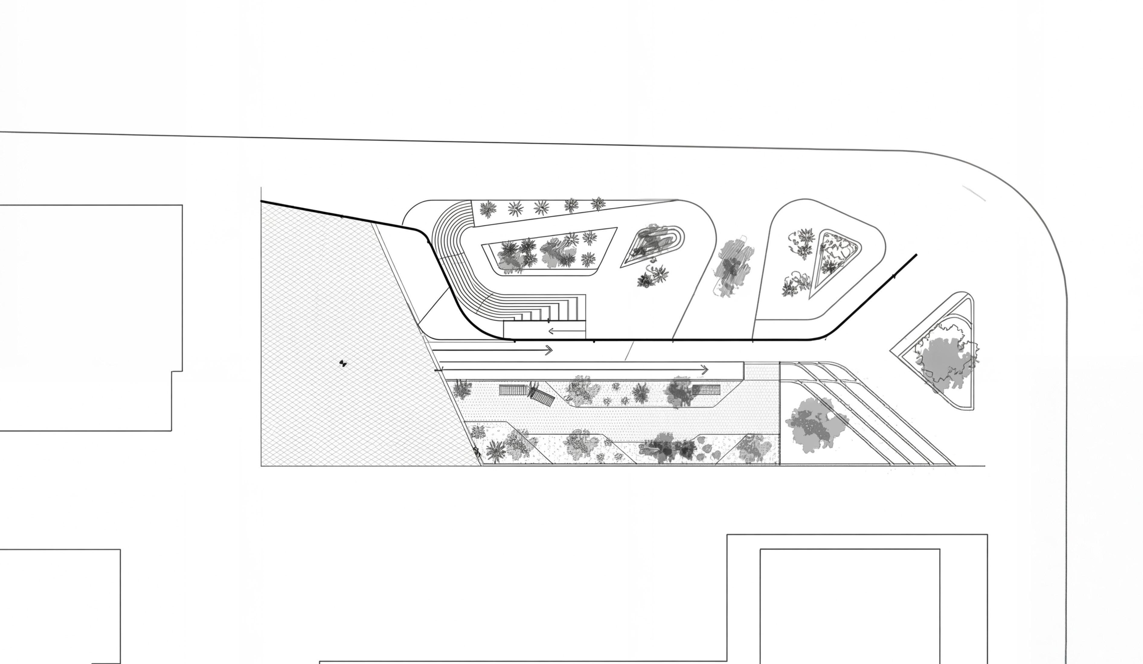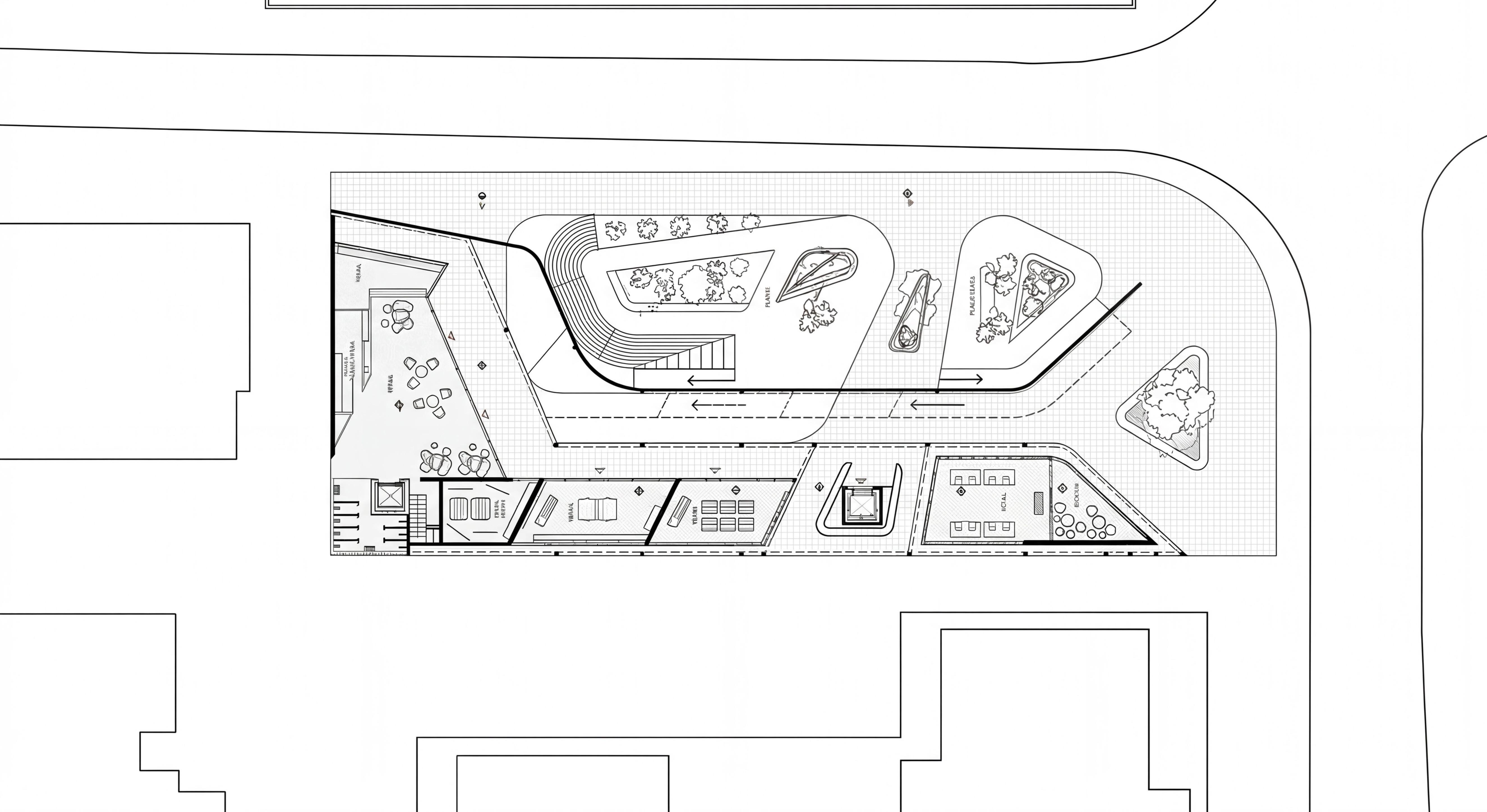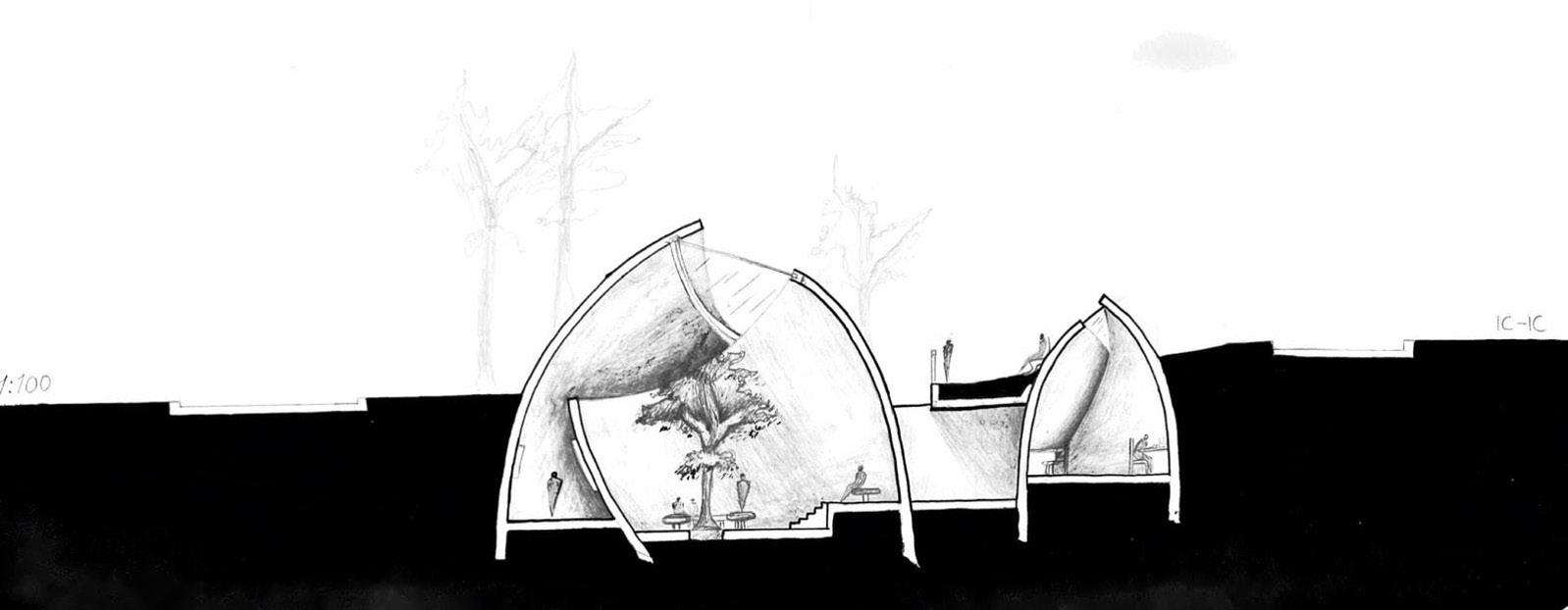 The forms are continuous curves with no straight lines — organic transitions that preserve the natural landscape while enclosing new communal space. Interior and exterior remain deliberately ambiguous. The result is a community architecture that does not announce itself, but instead becomes an extension of the park, a place where the boundary between gathering and solitude is soft enough to choose.