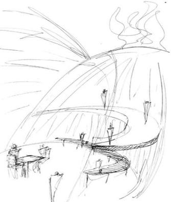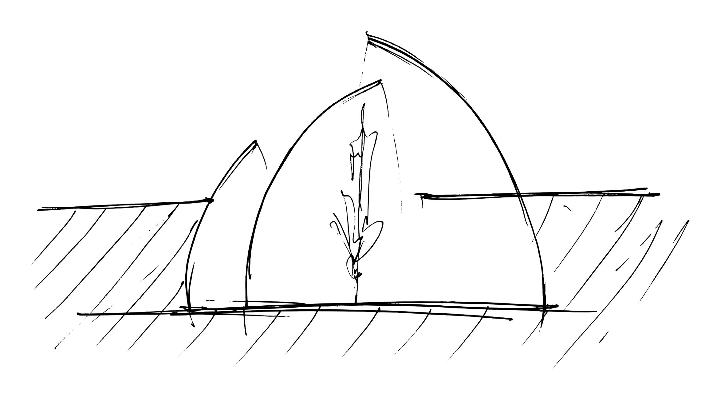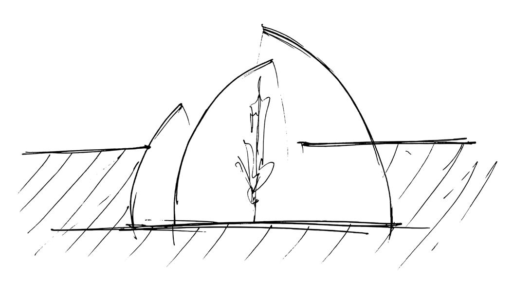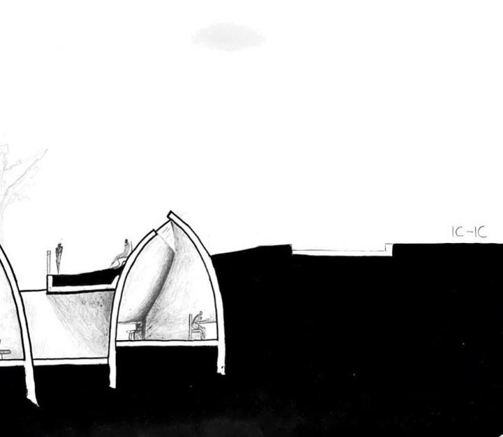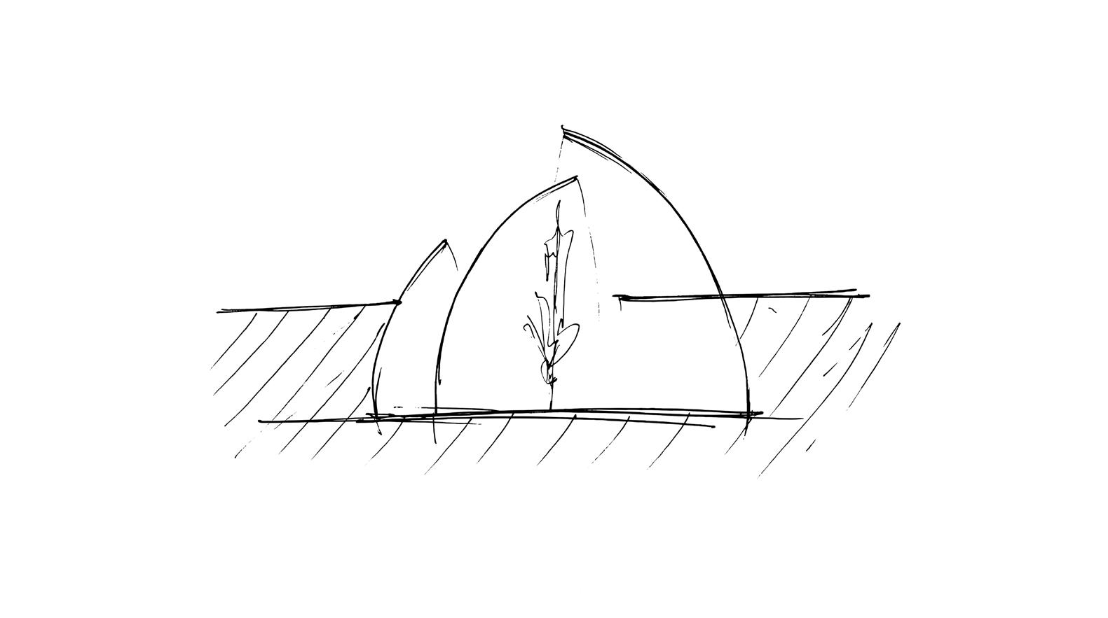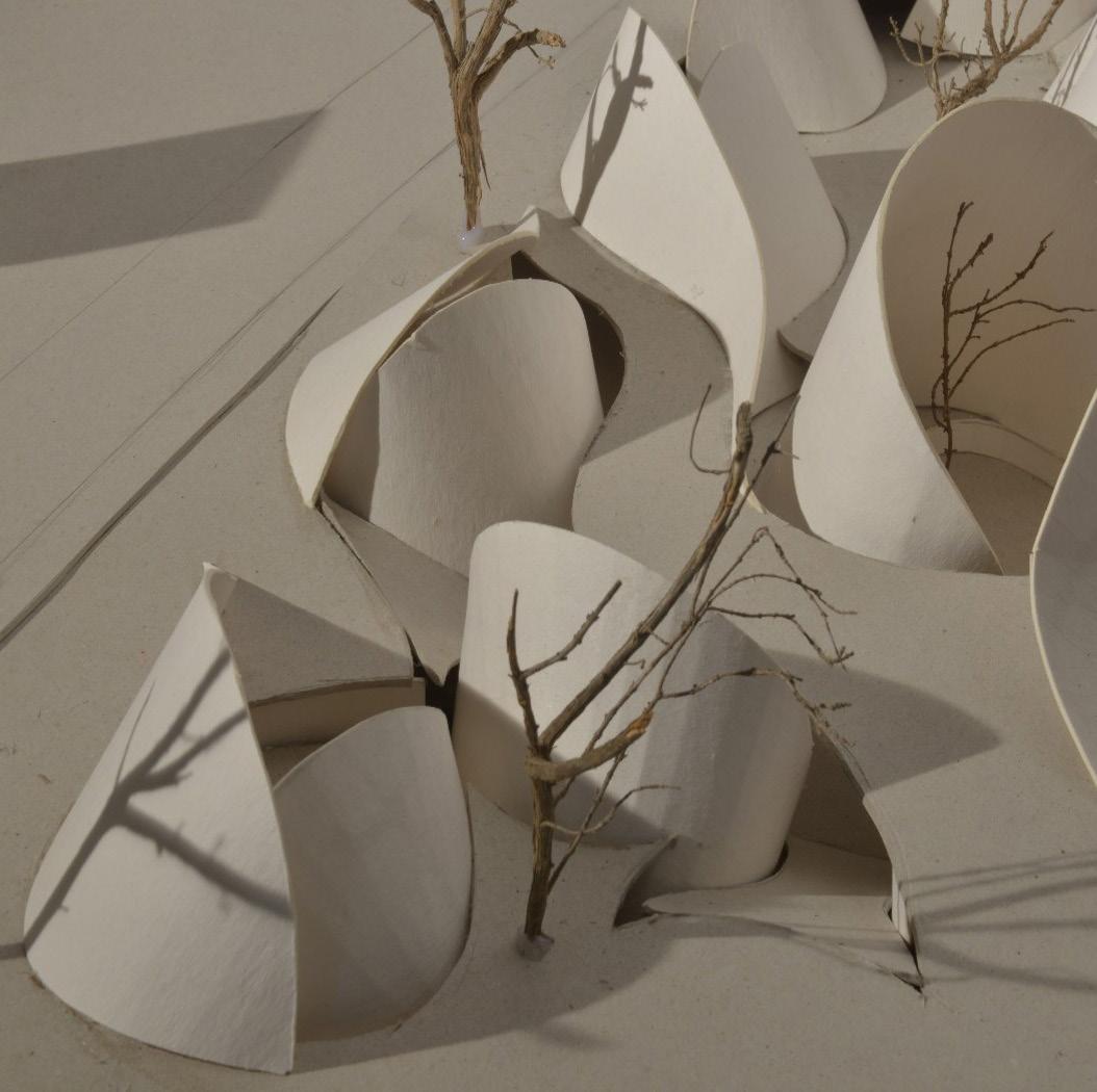 The forms are continuous curves with no straight lines — organic transitions that preserve the natural landscape while enclosing new communal space. Interior and exterior remain deliberately ambiguous. The result is a community architecture that does not announce itself, but instead becomes an extension of the park, a place where the boundary between gathering and solitude is soft enough to choose.