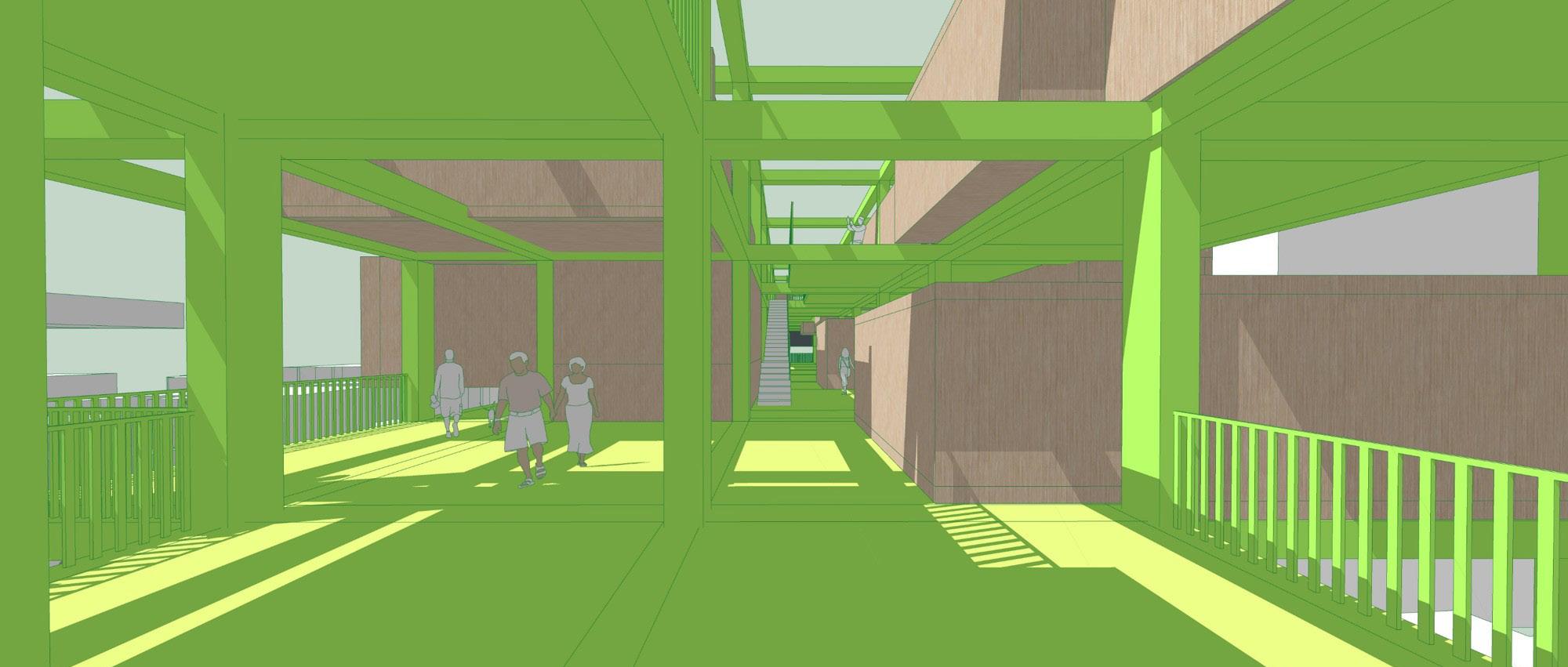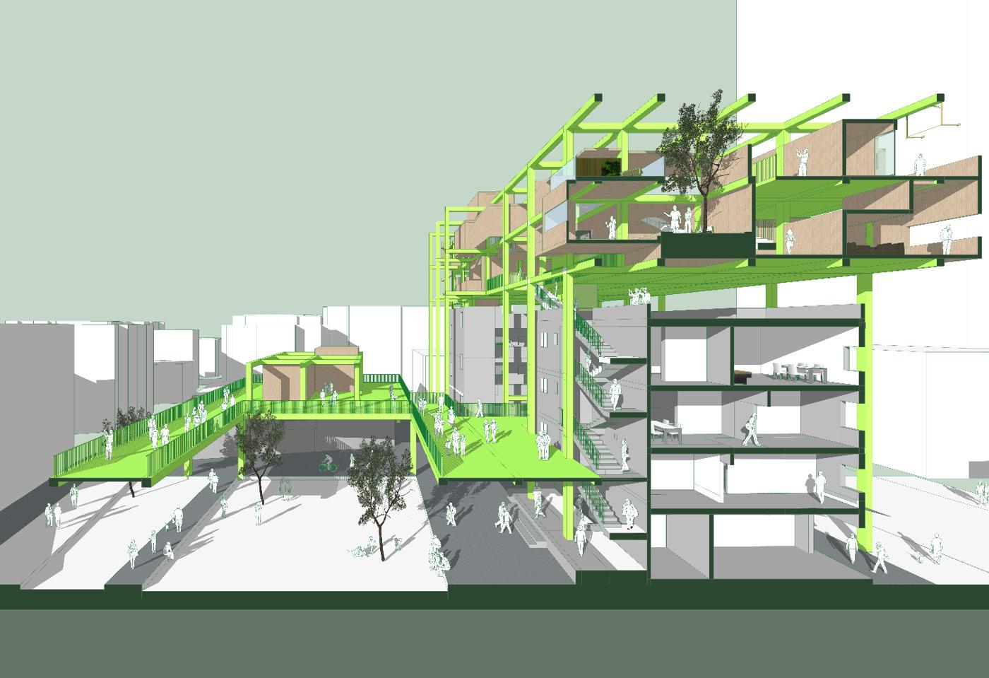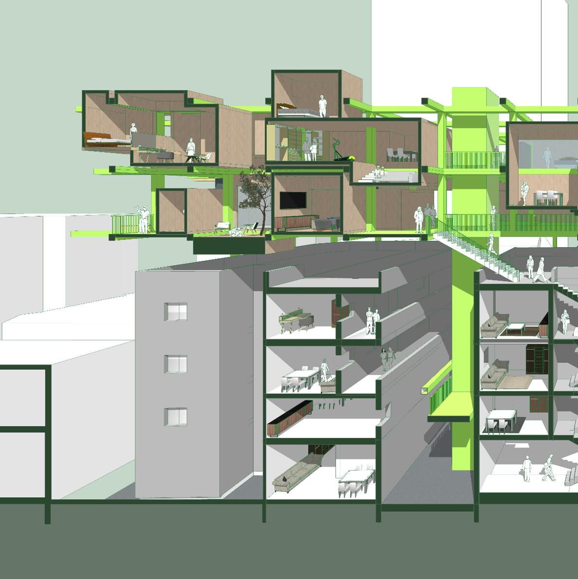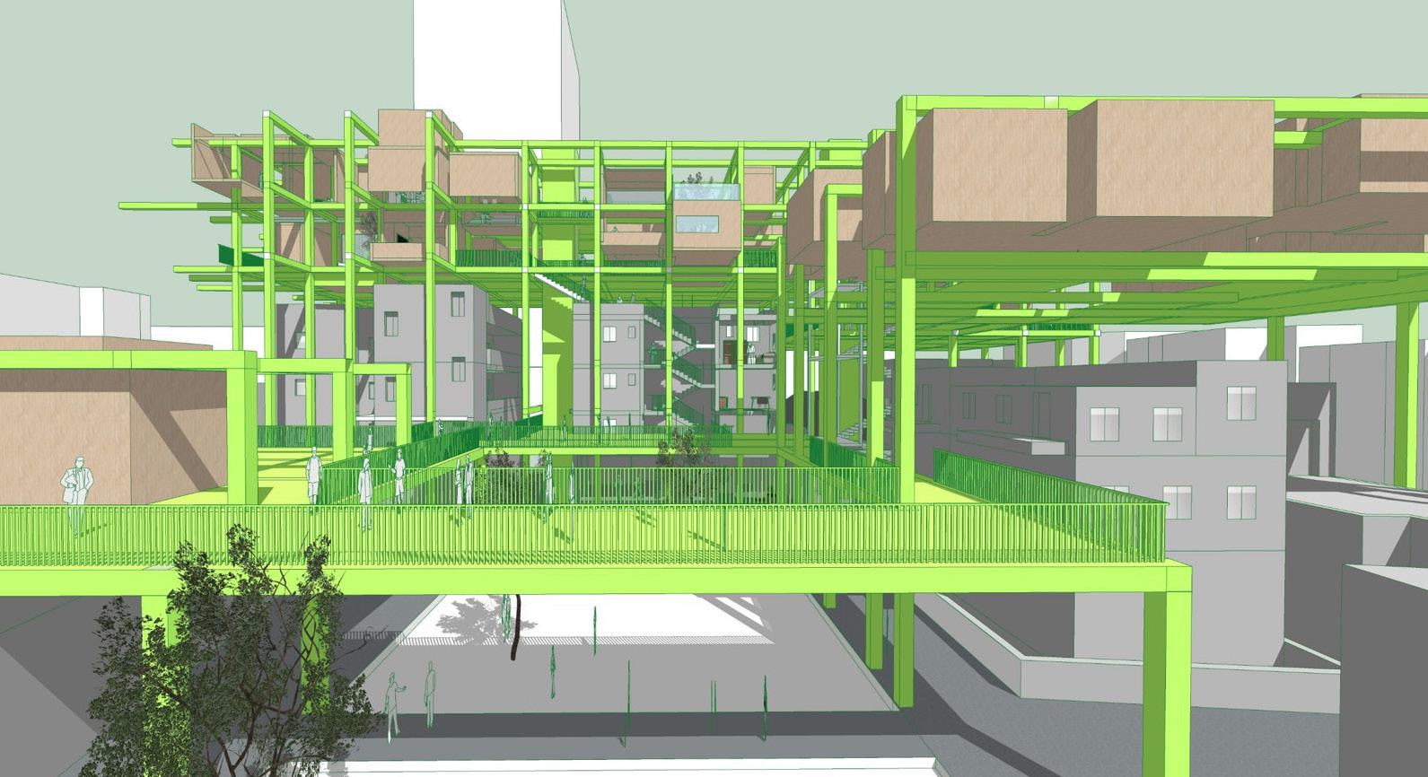 New apartments are inserted above and between existing structures. Corridors become streets. Rooftops become shared ground. The city does not start over — it continues, differently.