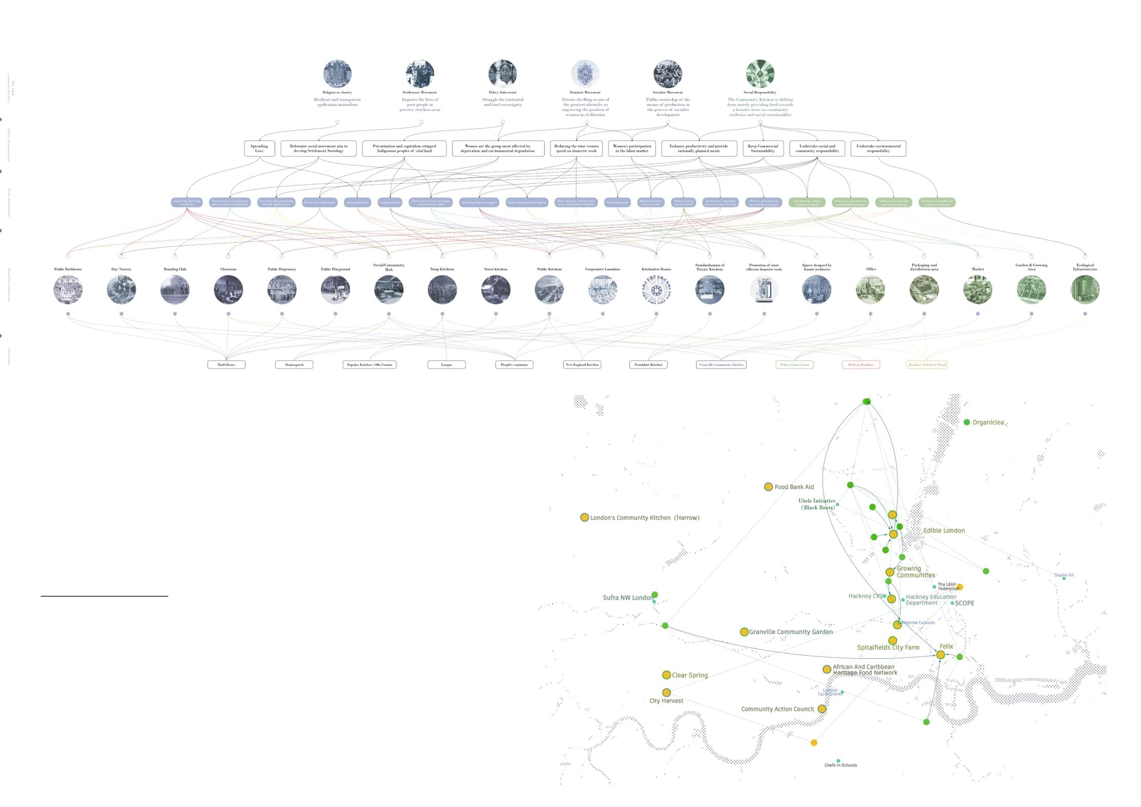 Using GIS, I analyzed the relational networks of several typical landed community kitchens in London. These networks include organizations that supply food, landed gardens, funding bodies, and