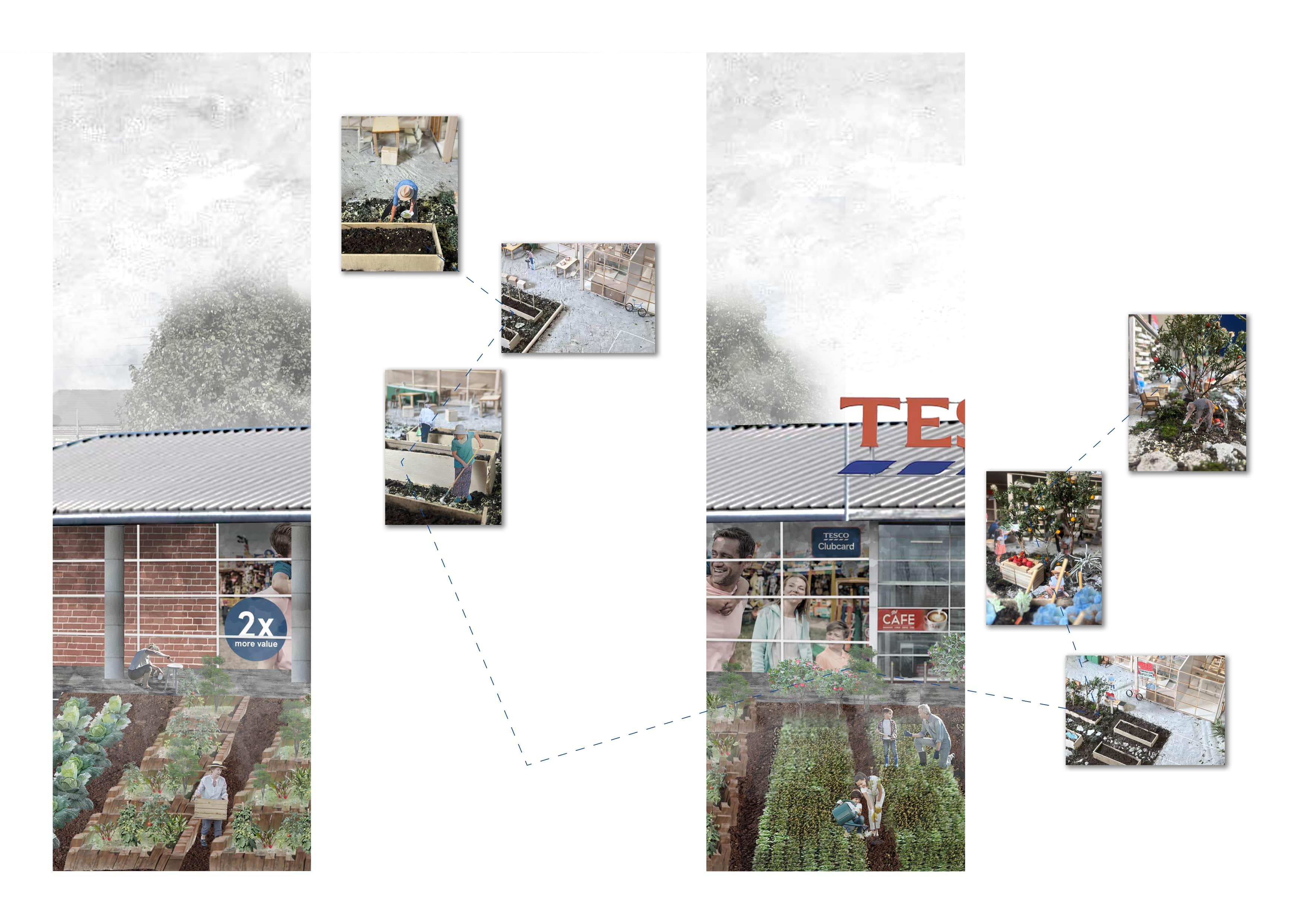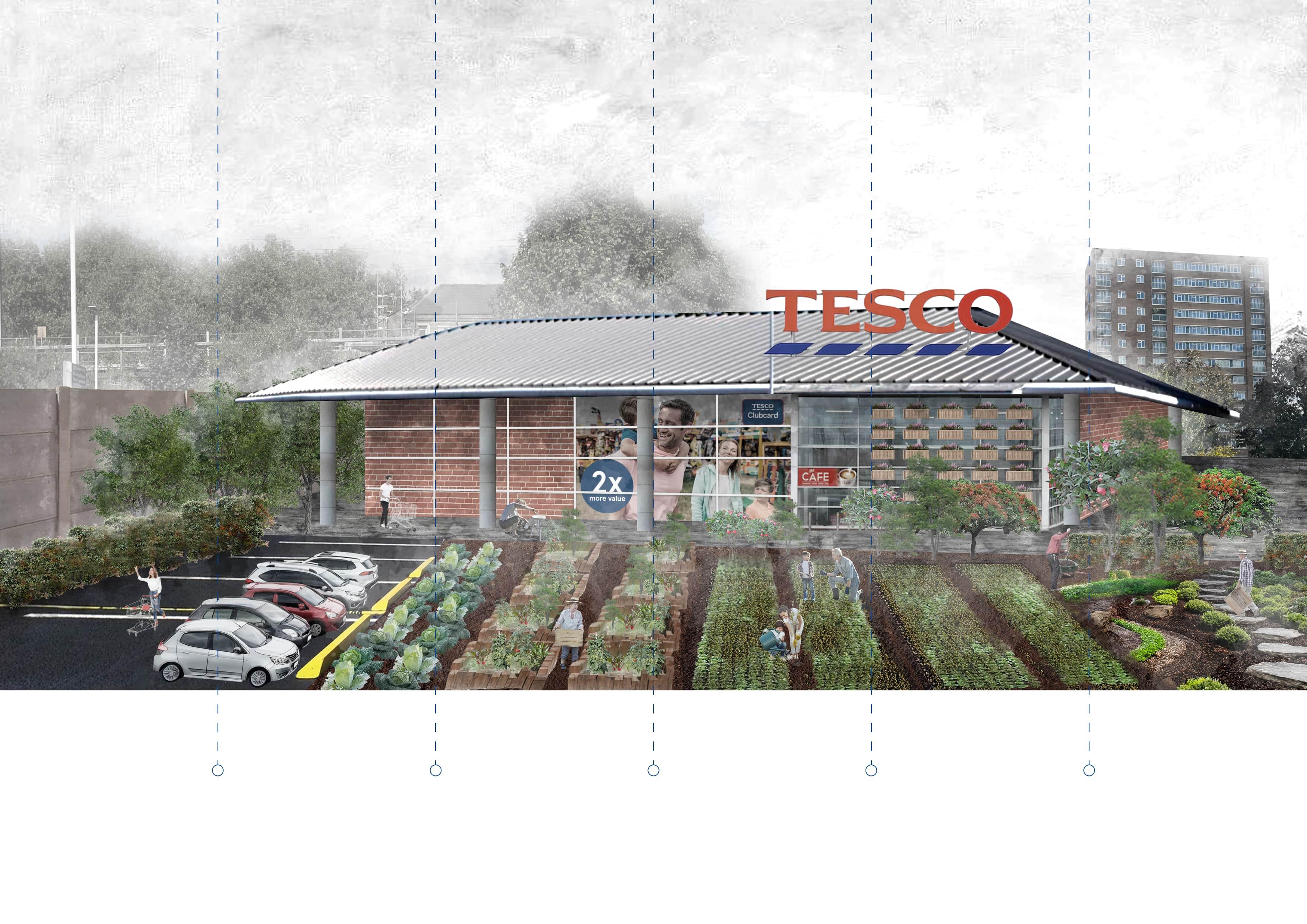The site is currently occupied by a Tesco supermarket and a parking lot, with limited greenery apart from a few street trees. Most of the surface is covered in concrete, creating a somewhat artificial environment. The parking lot is underutilized, with only half of the space regularly in use. Inside the Tesco, while there is a high demand for fresh produce, it occupies only a small portion of the shelves. Given the overcrowding of supermarkets in the area, this Tesco location is not essential, suggesting potential for transformation into a more community-serving space. In the first phase, part of the parking lot is converted into an agricultural planting area, restoring the natural ecosystem previously covered by concrete. The concrete is reused as stepping stones, reducing waste while balancing aesthetics and functionality. As the supermarket shrinks in size, the community gradually reduces its dependence on external supplies of fresh vegetables, focusing instead on locally produced greens. Through the initial restoration of the land, community agriculture is emerging as a local source of