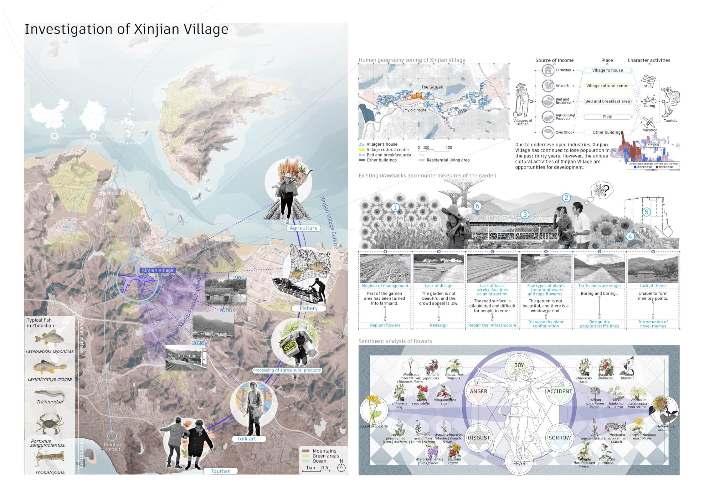 I want my design to offer visitors a unique experience and create a space that connects tourists with villagers and fosters connections among villagers themselves. My chosen location is the flower fields in Xinjian Village, which are currently disorganized and chaotic. In my preliminary research, I delved into the local culture of Xinjian Village, including fisheries , agriculture, villagers' art, and tourism.