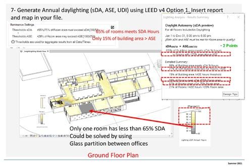 simulation and reports using LEED v4 Option2 Illuminnance and daylight customized Illuminnance and daylight customized Daylight factor simulation and reports using LEED v4 Option2 Annual Daylight (SDA, ASE, UDI) simulations, report and improvements