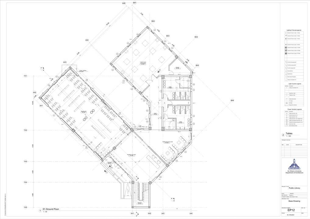 Architecture working draw ings for design studio 4 proj ect the library project of area 15,000 m2. It contains layout, four floor plans, two sections and 4 elevations