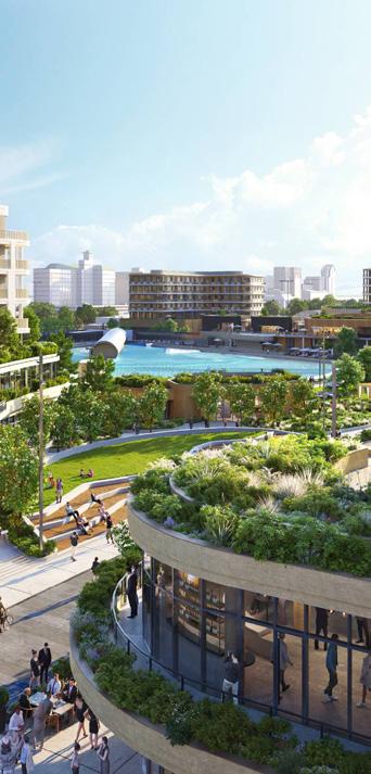 Rooftop restaurants will maximize surface area of buildings, while providing residents of the apartments, locals, tourists, and athletes a unique dining experience. By activating the rooftops of all district buildings, the upper floors become a secondary city scape of activity.