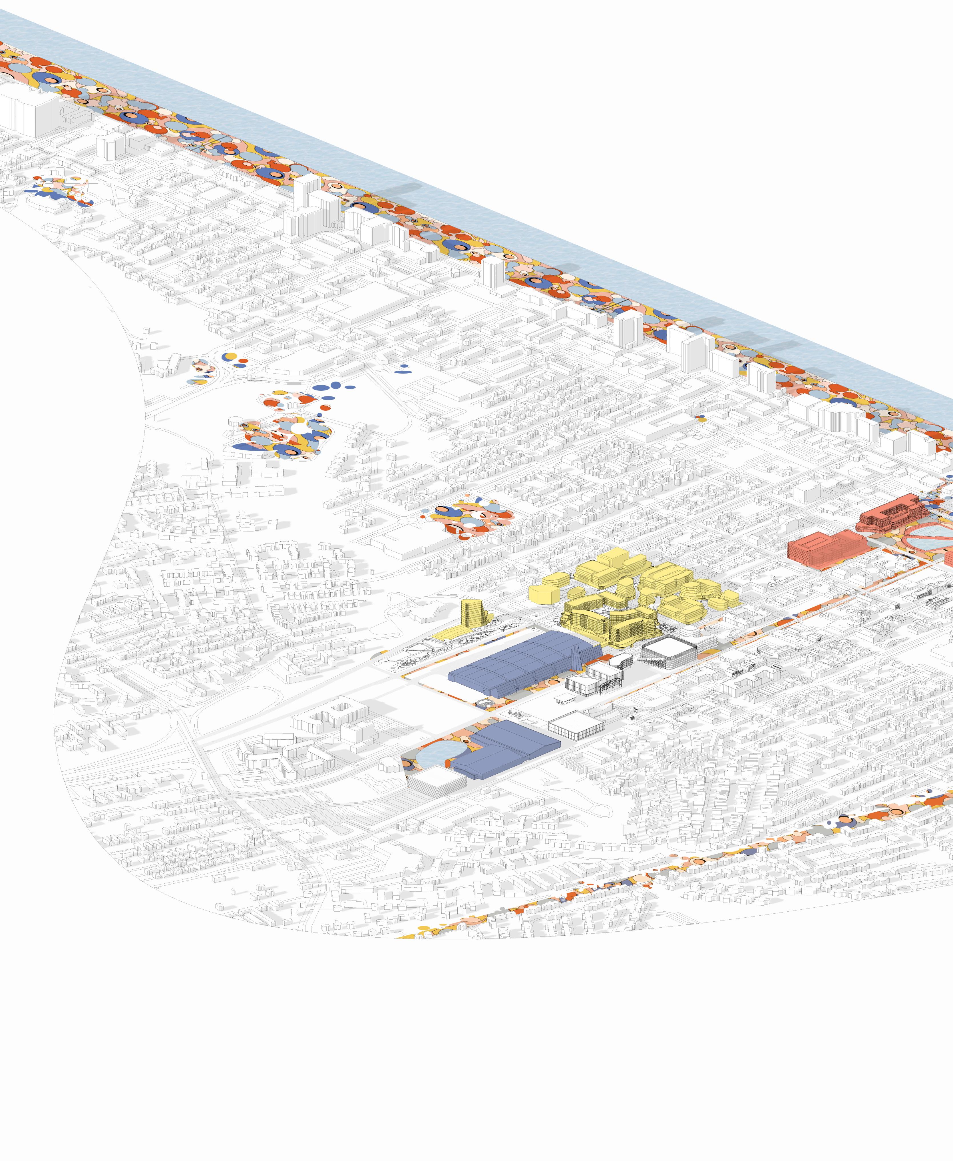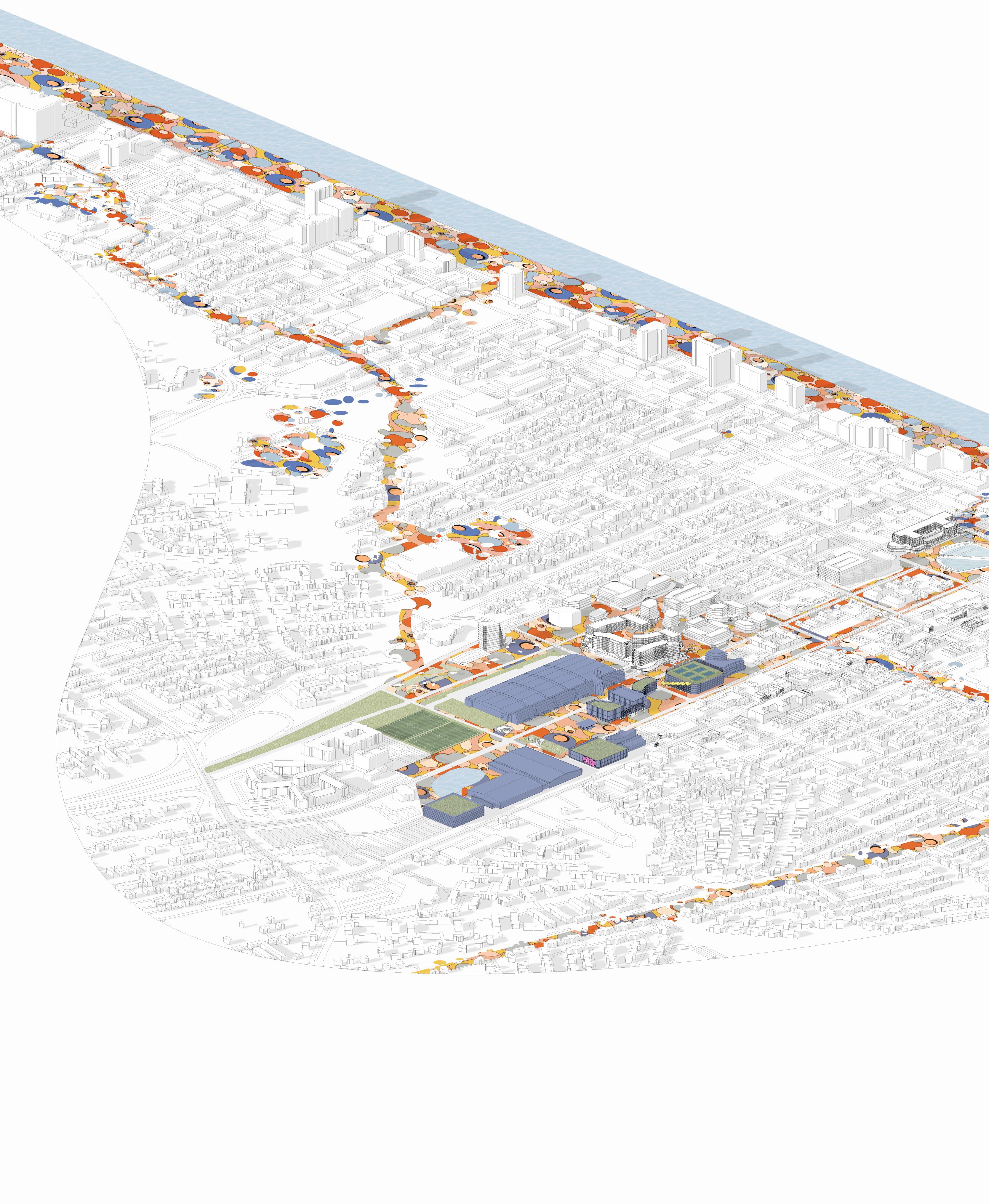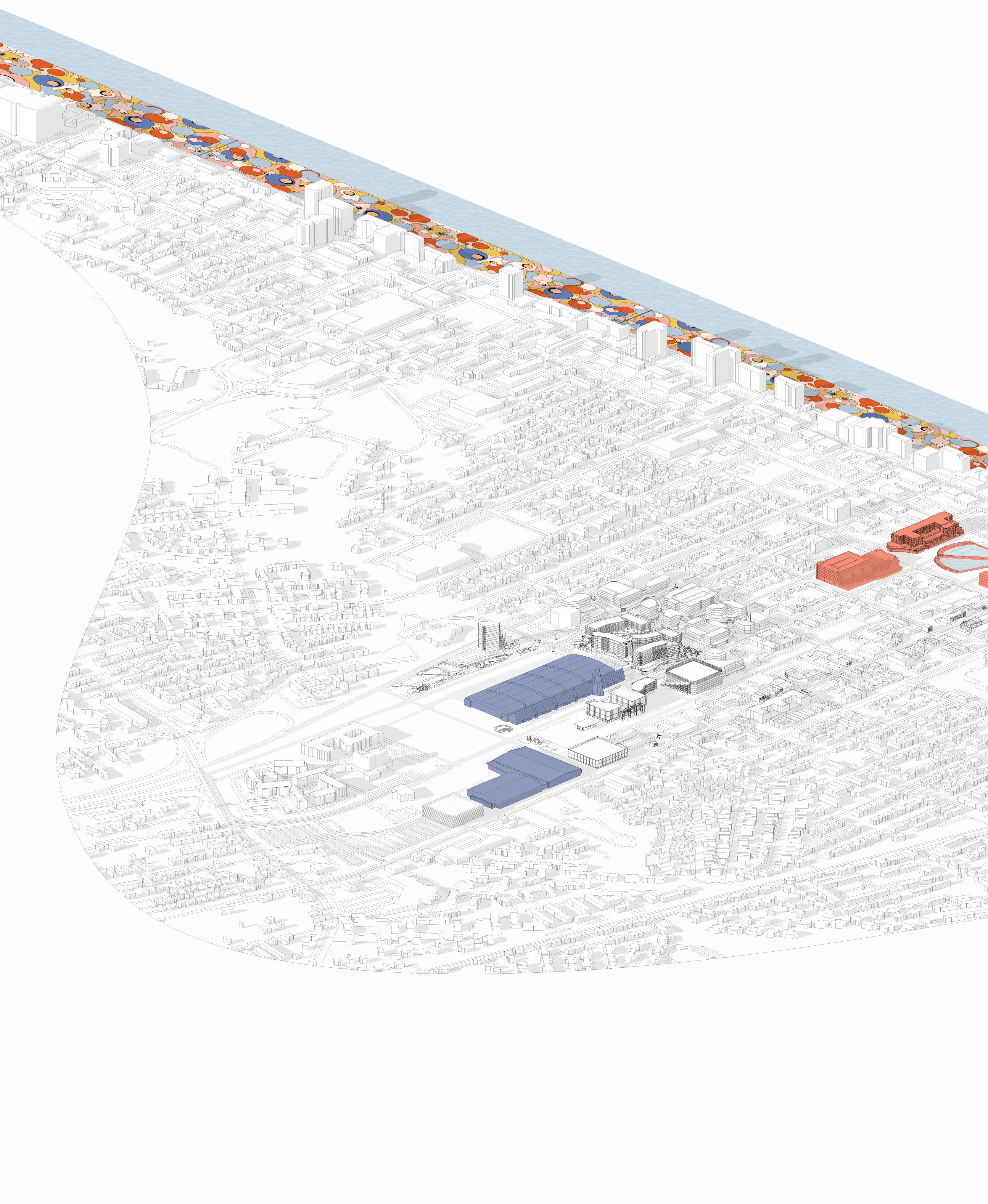 From this research, we developed a district proposal, creating a centralized pedestrian hub of activity related to sports and arts, all while facilitating east-to-west connectivity with the boardwalk.
