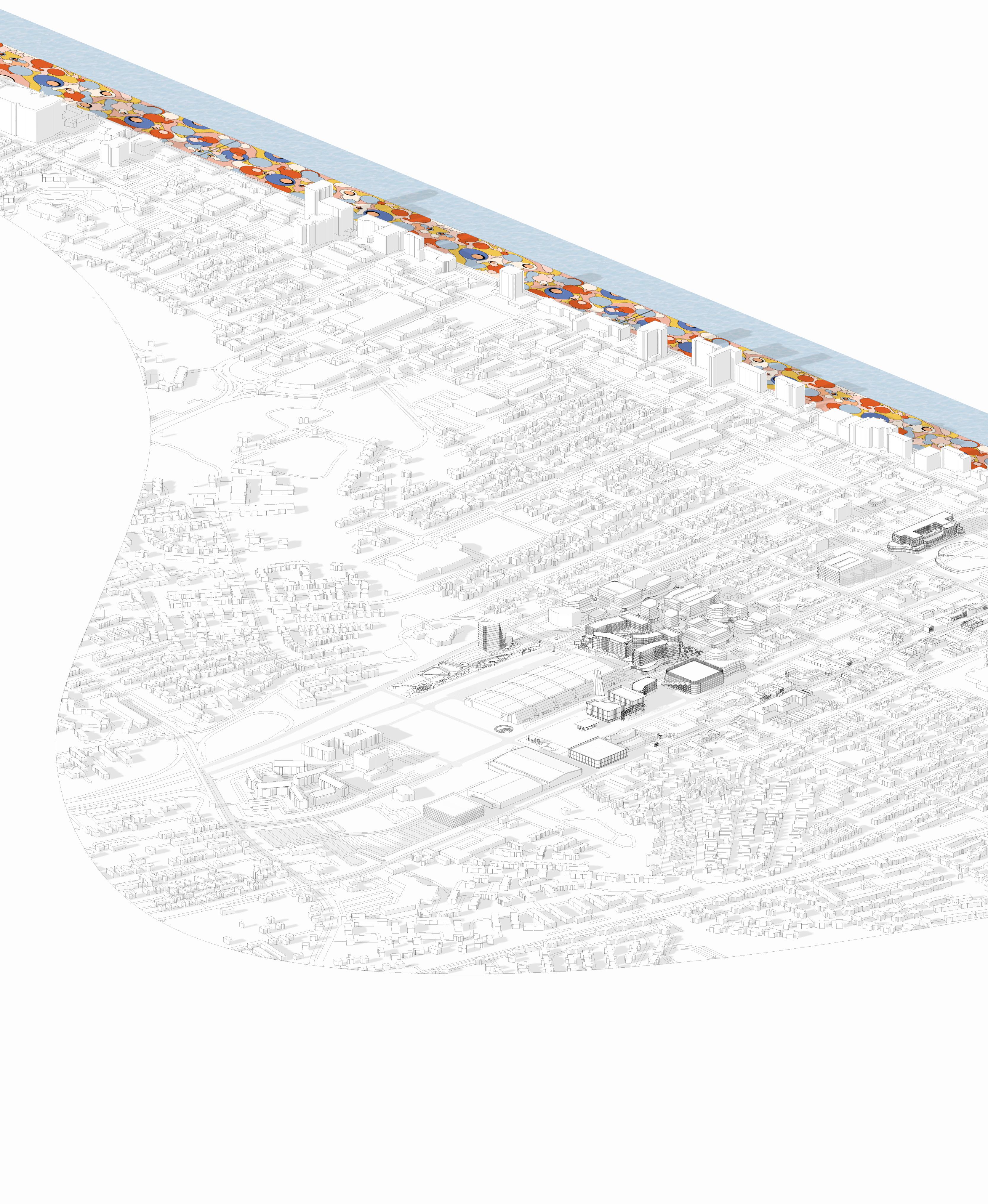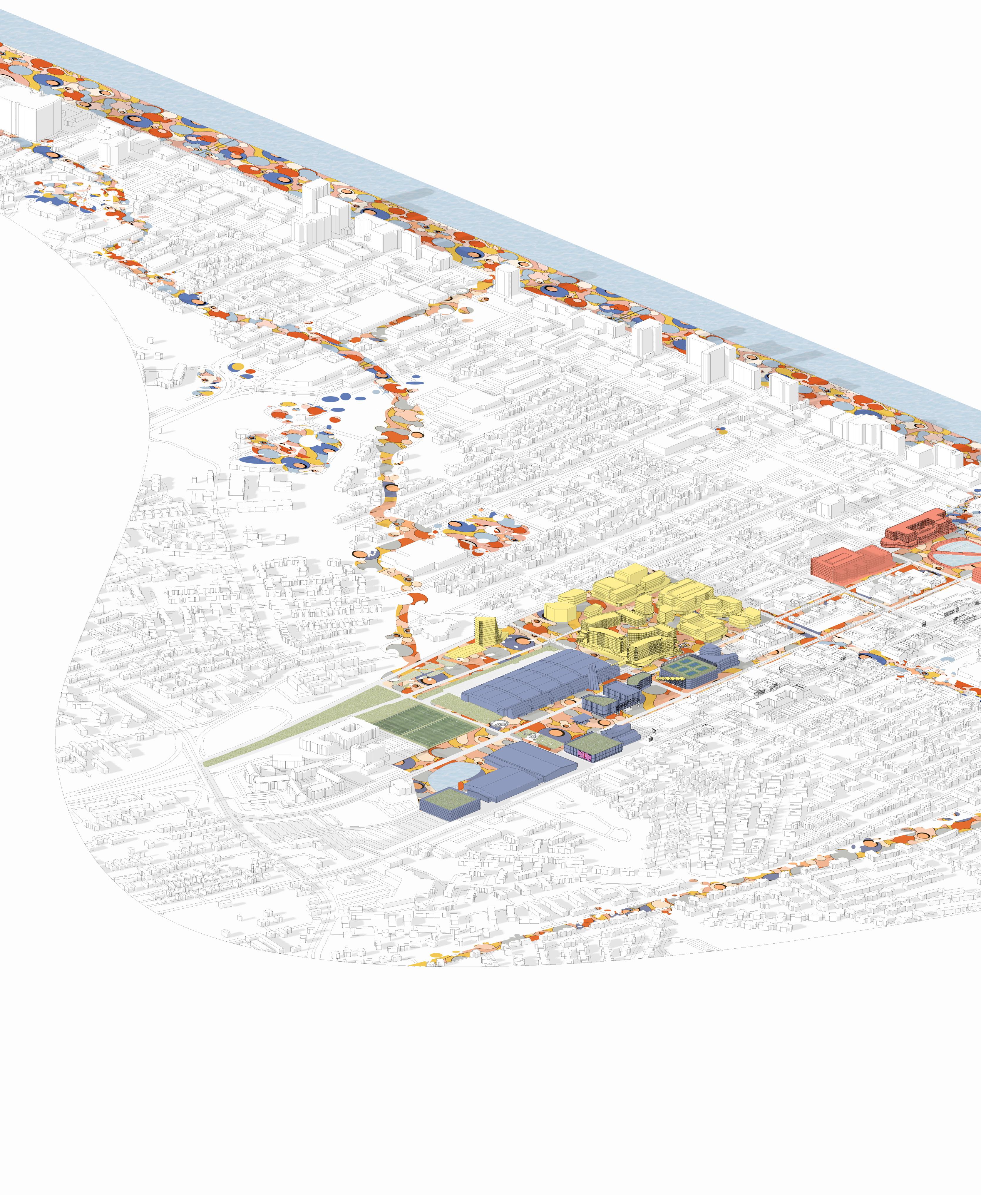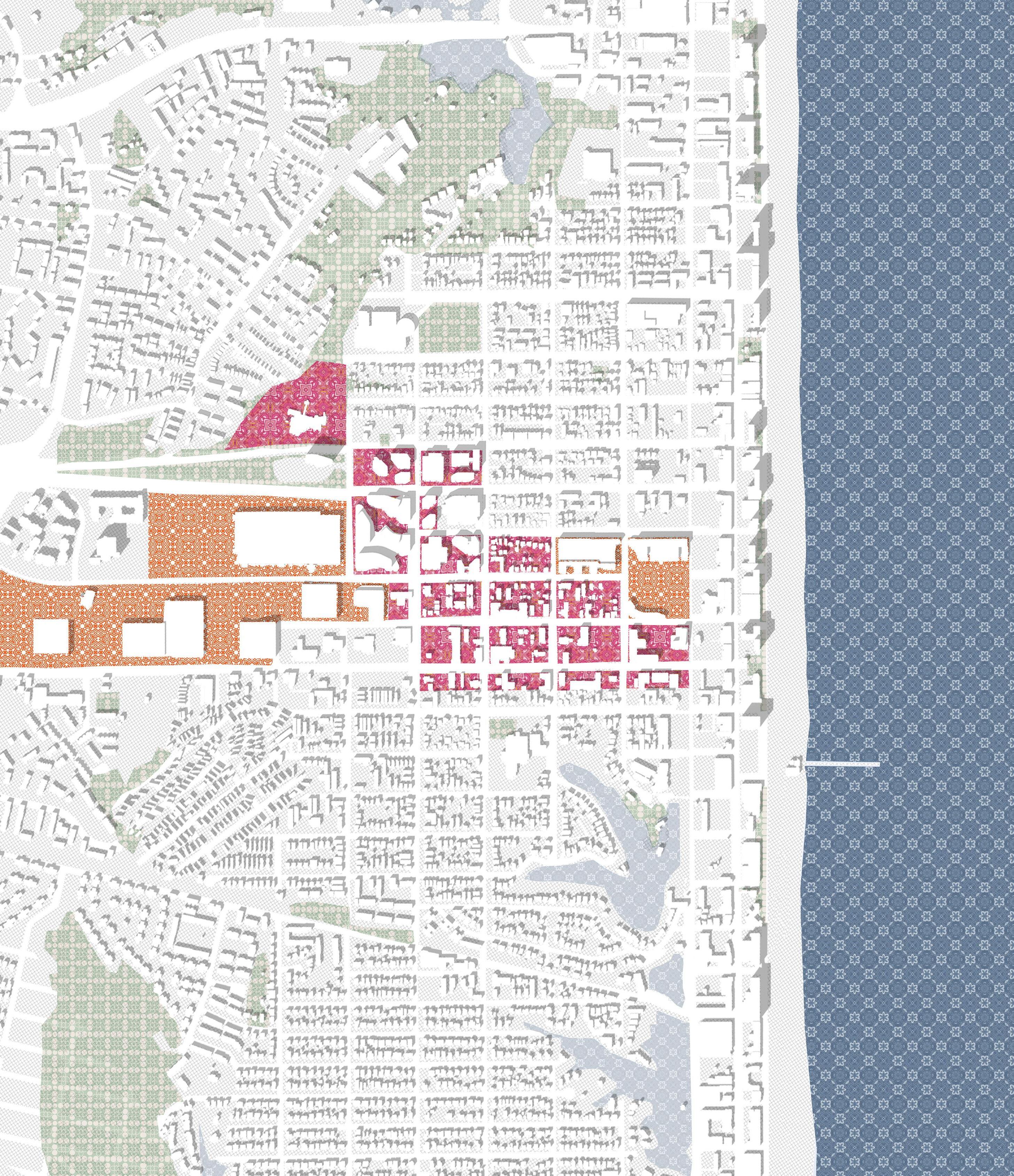 From this research, we developed a district proposal, creating a centralized pedestrian hub of activity related to sports and arts, all while facilitating east-to-west connectivity with the boardwalk.