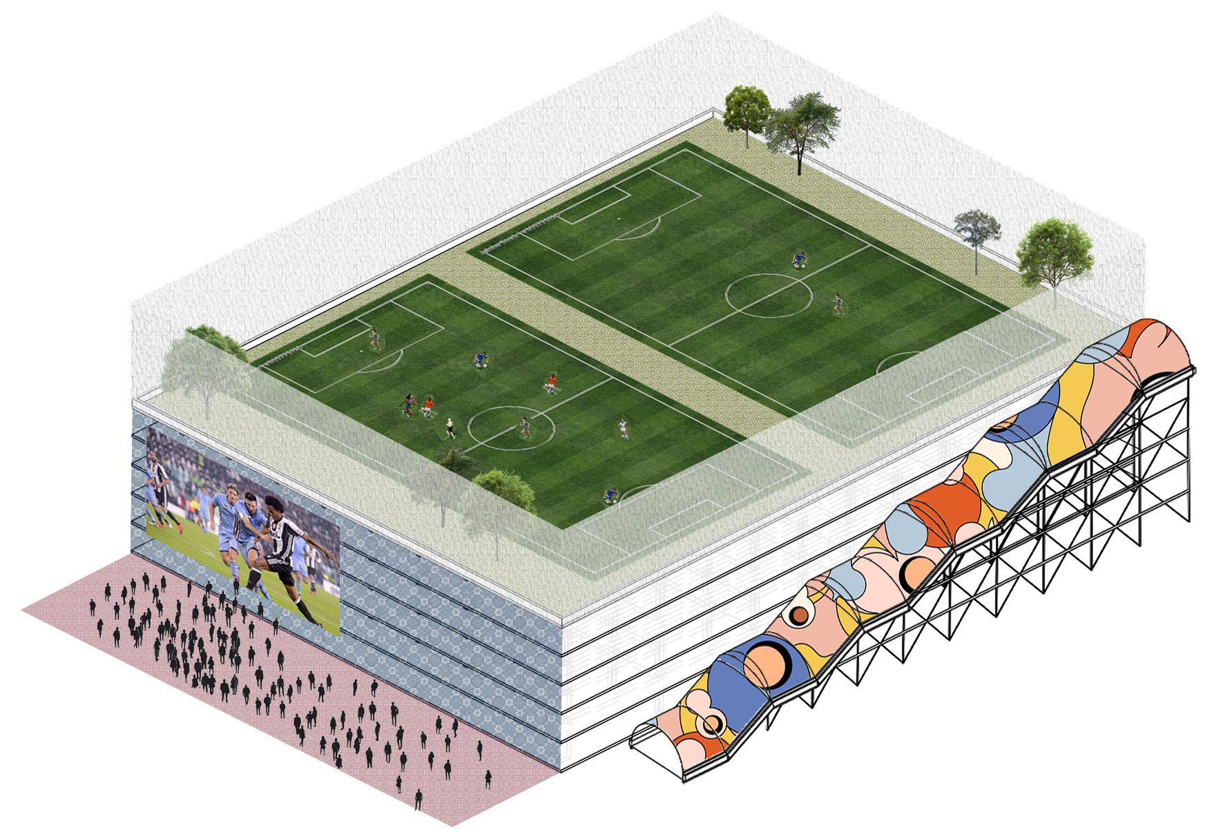 By creating a typology of including restaurants on the lower levels of the buildings, pedestrians are more likely to engage with the sports programs inside as well as support local cuisine.