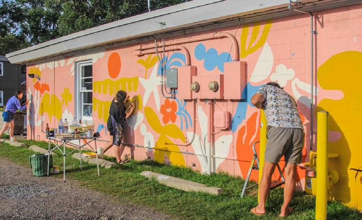Vibrant murals bring life to the facades of primarily one-story brick buildings throughout Virginia Beach. This mural on The Pink Dinghy was painted by artist Marleigh Culver as part of the annual Mural Festival in August 2020. The ViBe Creative District makes an effort to support local artists and business through various sponsorphip and grant programs.