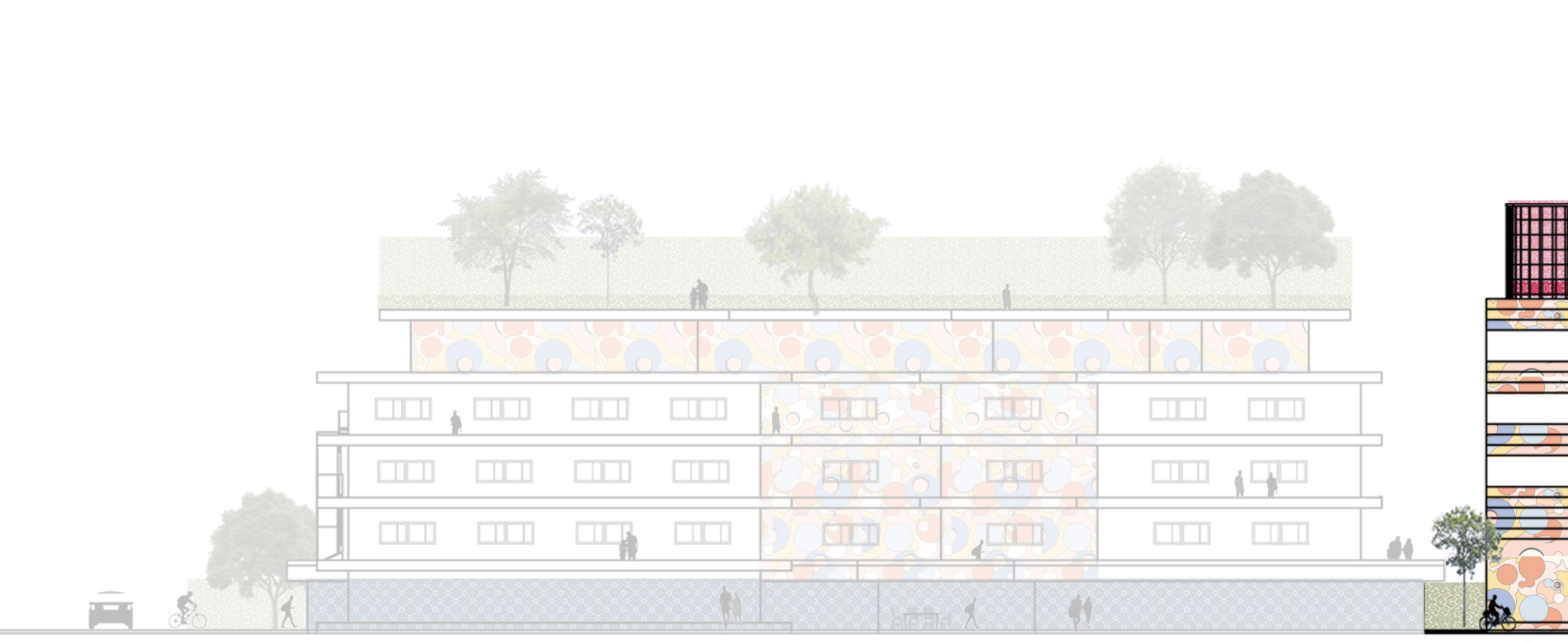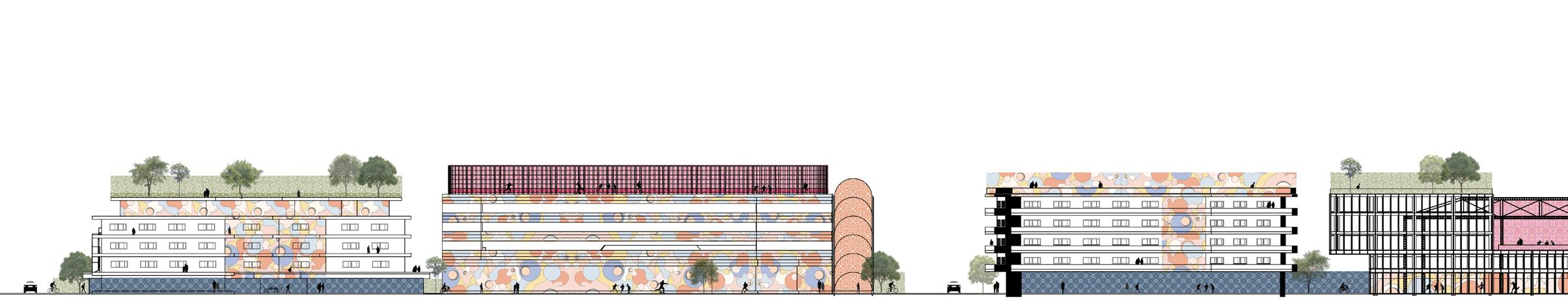 Patterned paving and murals connect the district. The ground floors of buildings open up to the public. Pedestrians are naturally encouraged to meander, rather than travel on a pre-determined path. In this manner, the district becomes a true thrid space: one that fosters long-term community.