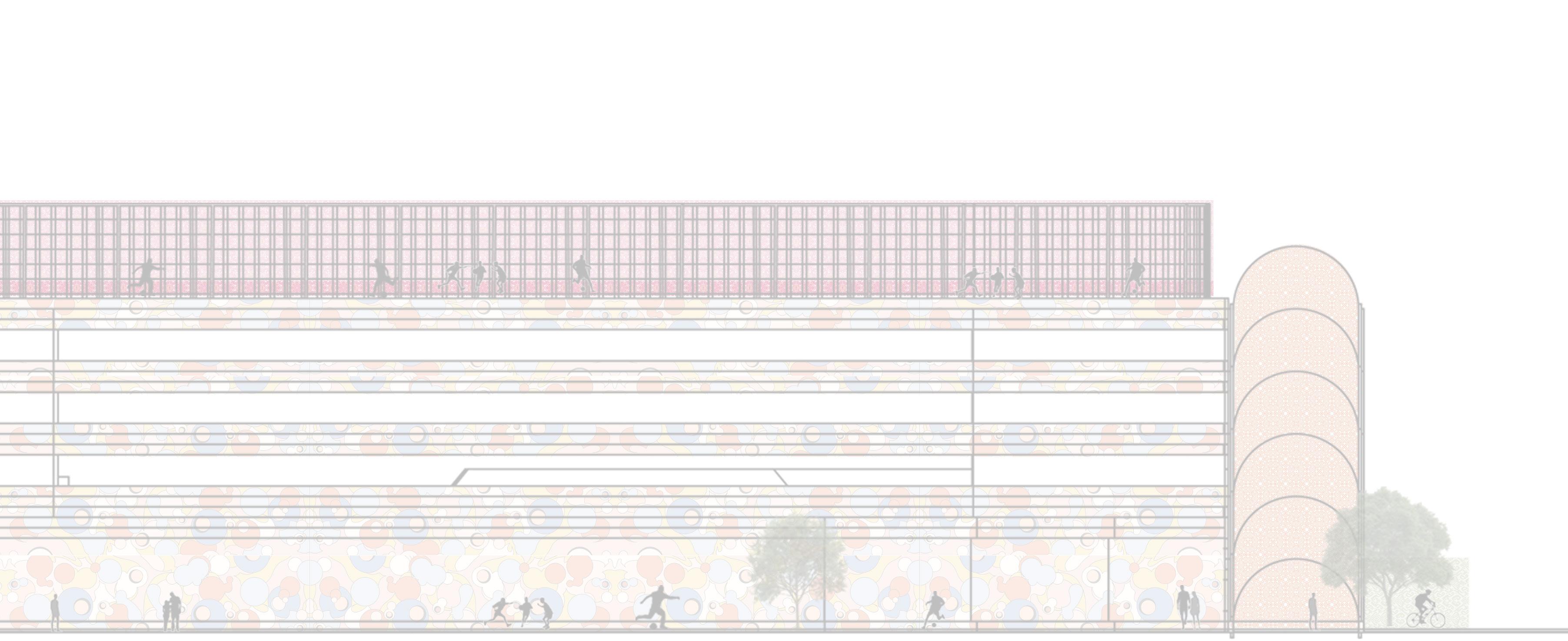 The stair on the side of the garage provides public access to the rooftop, encouraging pedestrians to walk up. By transforming the top deck of the garage, it becomes a crucial part of the districted, integrated into the sports and arts culture.
