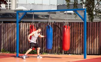 Rooftop parking decks provide a prime spot for maximized sport activity within the district. This parking garage is equipped with soccer fields for low-key pick-up games and athletes practing or warming up.