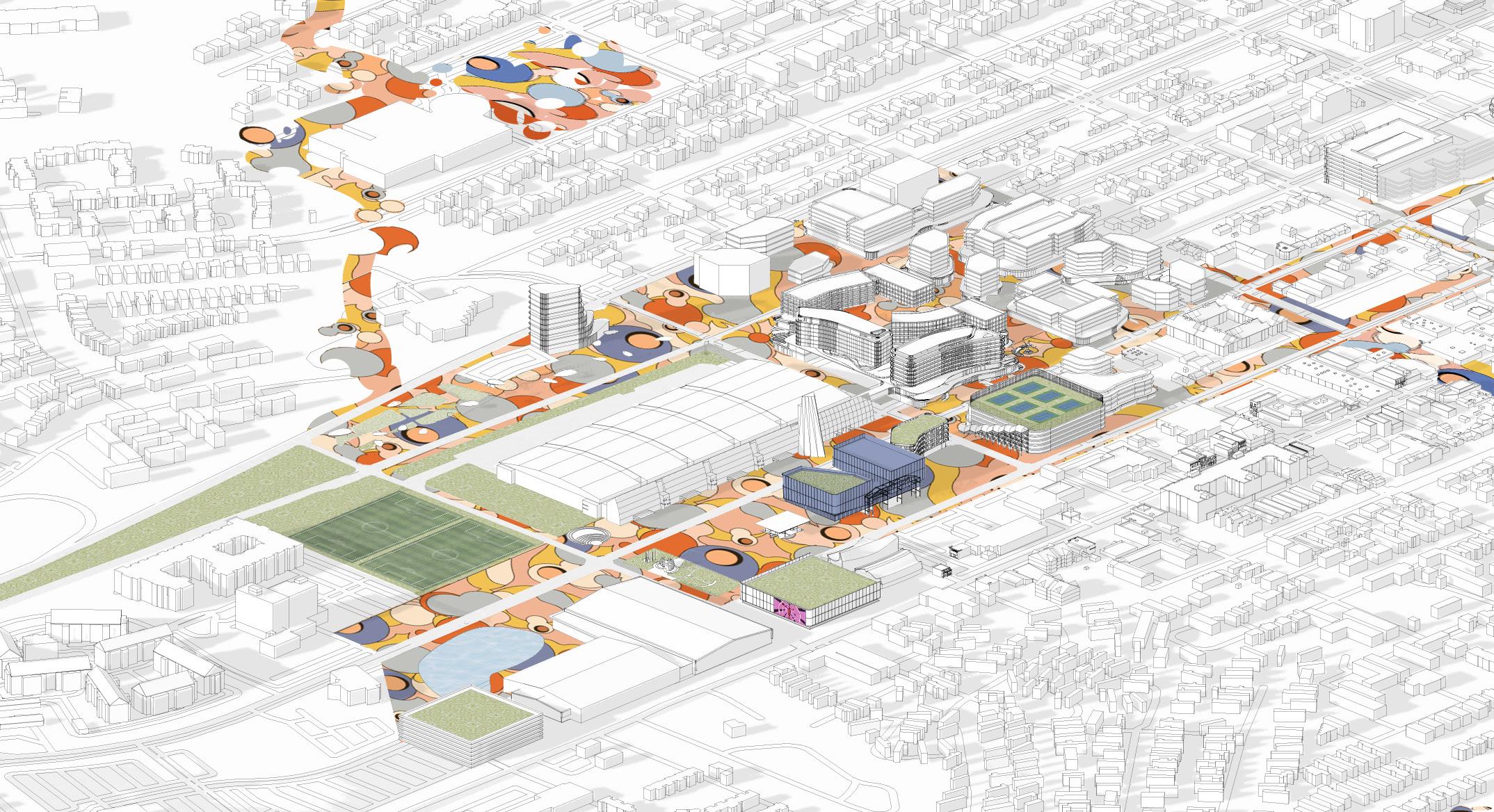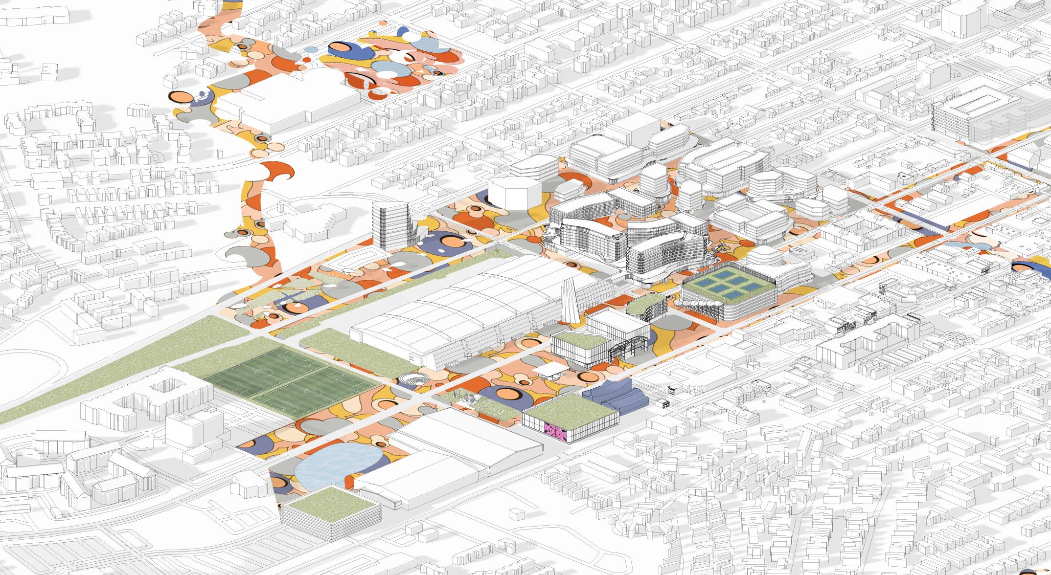 The proposed sports district (orange) builds off of the existing ViBe Creative District (pink), creating a walkable streetscape where sports & arts will occur in collaboration.