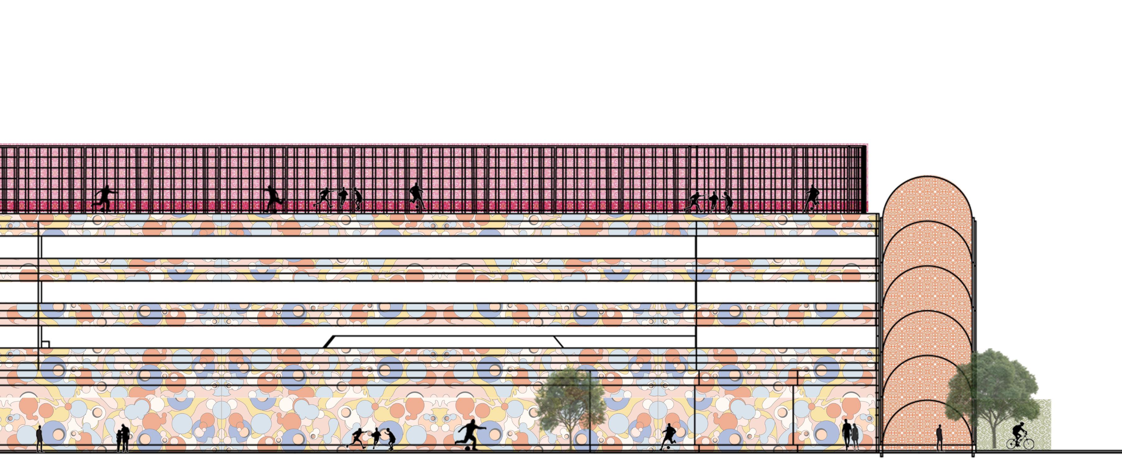 This parking garage is located next to the extreme sports gym and large open plaza, making it the prime spot to be incoporated into extreme sports. A freestyle track on the roof of the garage will allow for BMX biking to occur. The wall of the garage can be used as a projection screen at night for sports watch parties, public move nights, or festival events.