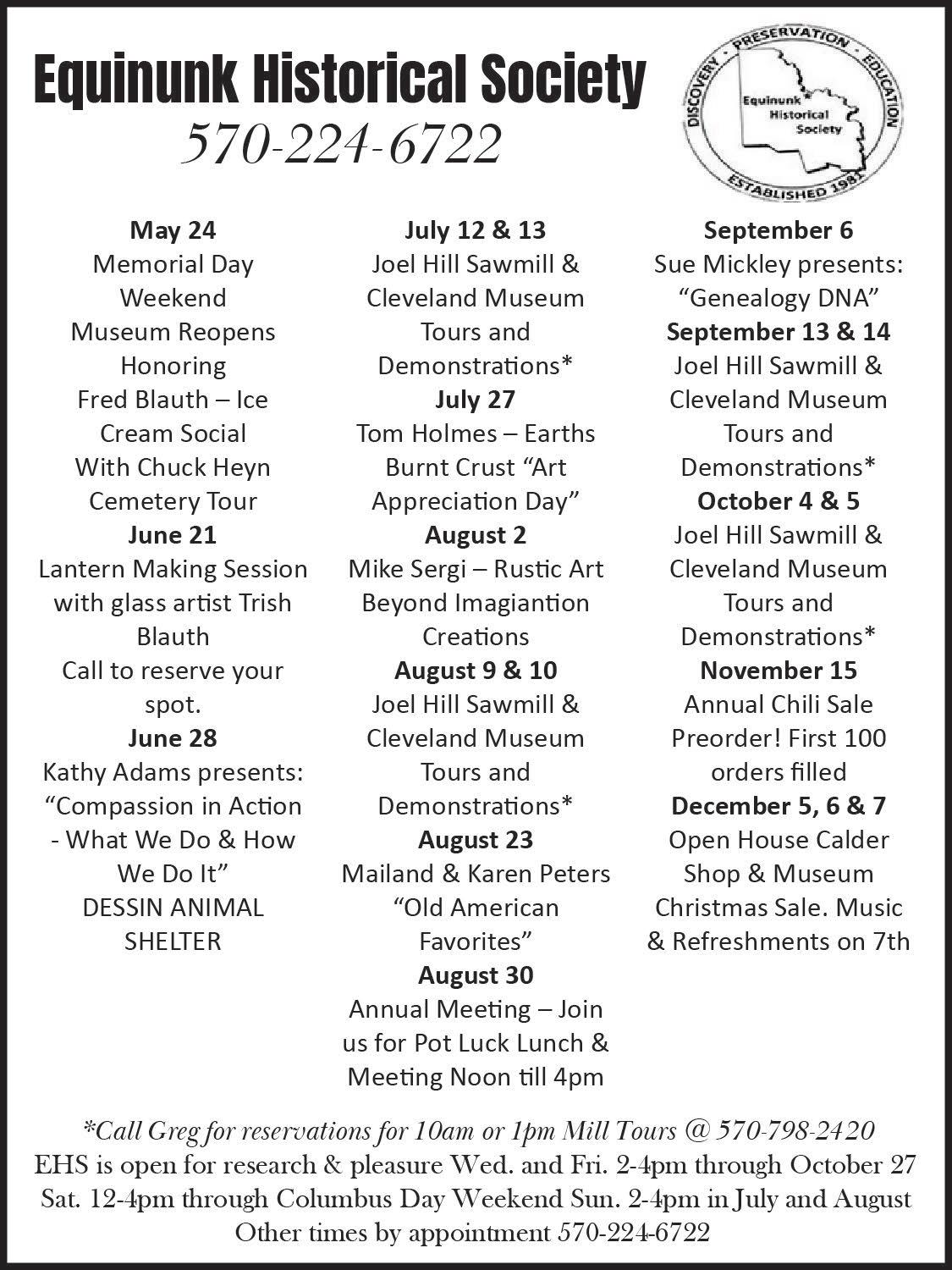 Sue Mickley program “Genealogy DNA” at The Equinunk Historical Society. Museum opens at noon. Program starts at one. 1972 Pine Mill Road, Equinunk, PA. 570-224-6722.