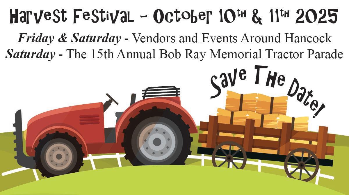 Hancock Harvest Festival and Bob Ray Memorial Tractor Parade Parade starts at 1 p.m. Harvest Festival vendors, food, and music at Hancock’s Town Square.